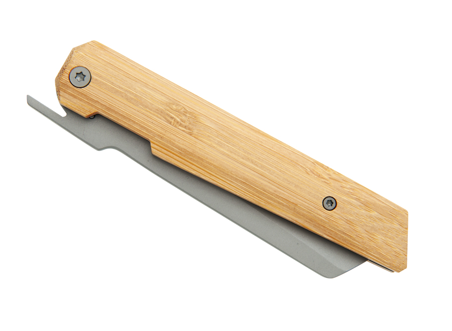 Klappbares Messer mit Klinge aus 420er Edelstahl für den Lebensmittelgebrauch und Titanbeschichtung. Montage mit Torx-Schrauben. Griff auf Bambus. Sicherheitsverriegelung vom Typ Liner-Lock. Wird in einem melierten grauen Etui aus RPET geliefert. Die Vorteile in Kürze: - Klinge aus 420er Edelstahl, die eine maximale Beständigkeit gegen Oxidation gewährleistet und ein einfaches Schärfen ermöglicht. - Torx-Schrauben-Montage, um Reibung beim Öffnen zu reduzieren und die langfristige Funktionsfähigkeit zu erhalten. - Elegante Titanbeschichtung auf der Klinge für eine bessere Haltbarkeit. - Ein raffiniertes Sicherheitsverriegelungssystem namens Liner Lock, das zu den einfachsten zu bedienenden gehört. - Ein Design, das die großen Klassiker der japanischen Messerkunst widerspiegelt. - Präsentiert mit einem Etui aus RPET (recycelte Verpackung) statt einer wegwerfbaren Kartonverpackung.