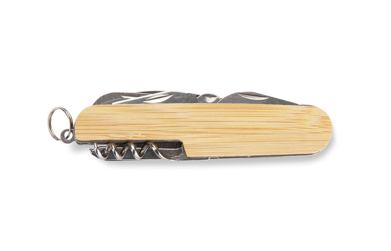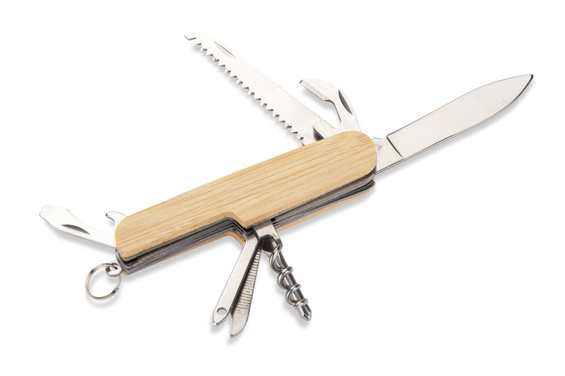 Das KANA-Taschenmesser mit Bambusgriff zeichnet sich durch sein einzigartiges, natürliches Aussehen aus. Ausgestattet mit Alltags- und Outdoor-Funktionen: Messer, Säge, Fischschaber, Dosen- und Flaschenöffner, Schraubendreher, Korkenzieher, Ahle, Lederlocher und einem Schlüsselring. Ein praktisches Werbegeschenk, das in jeder Situation nützlich ist.