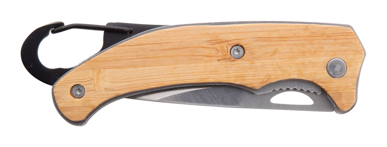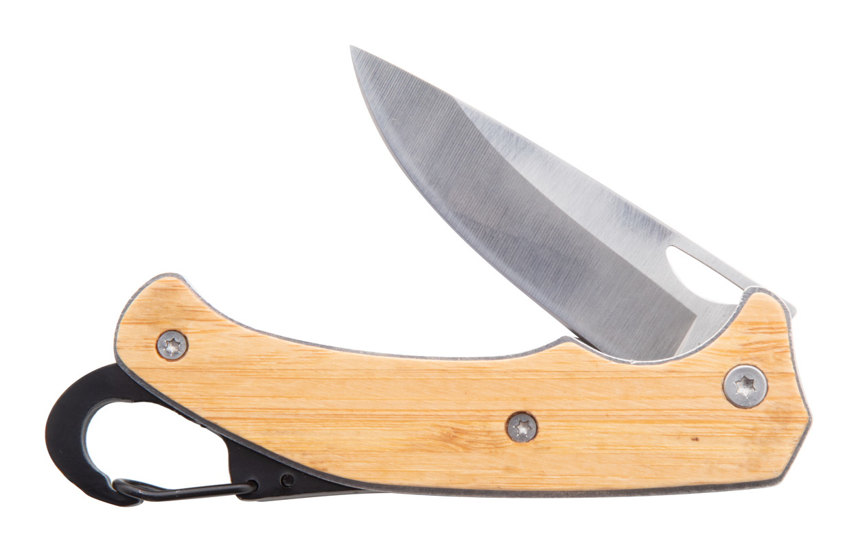 Taschenmesser aus Edelstahl mit Bambusgriff, Karabinerhaken und Sicherheitsverschluss.