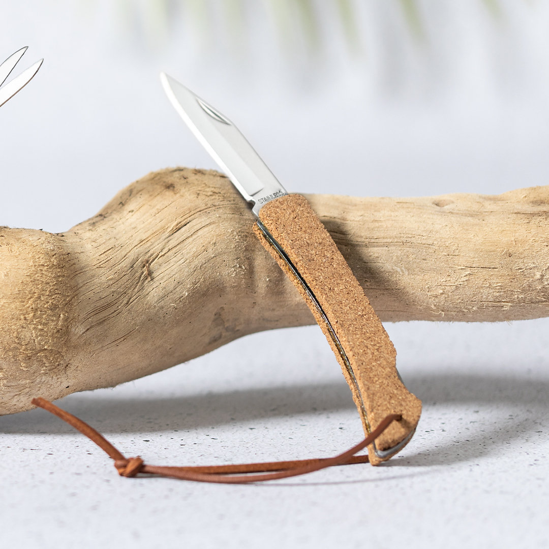 Messer der Nature-Linie mit Klinge aus rostfreiem Stahl und Griff aus Naturkork. Mit Arretierung und Kerbe an der Klinge zum einfachen Öffnen. Passendes PU-Lederarmband und präsentiert in einer individuellen Box mit Kraft-Design.