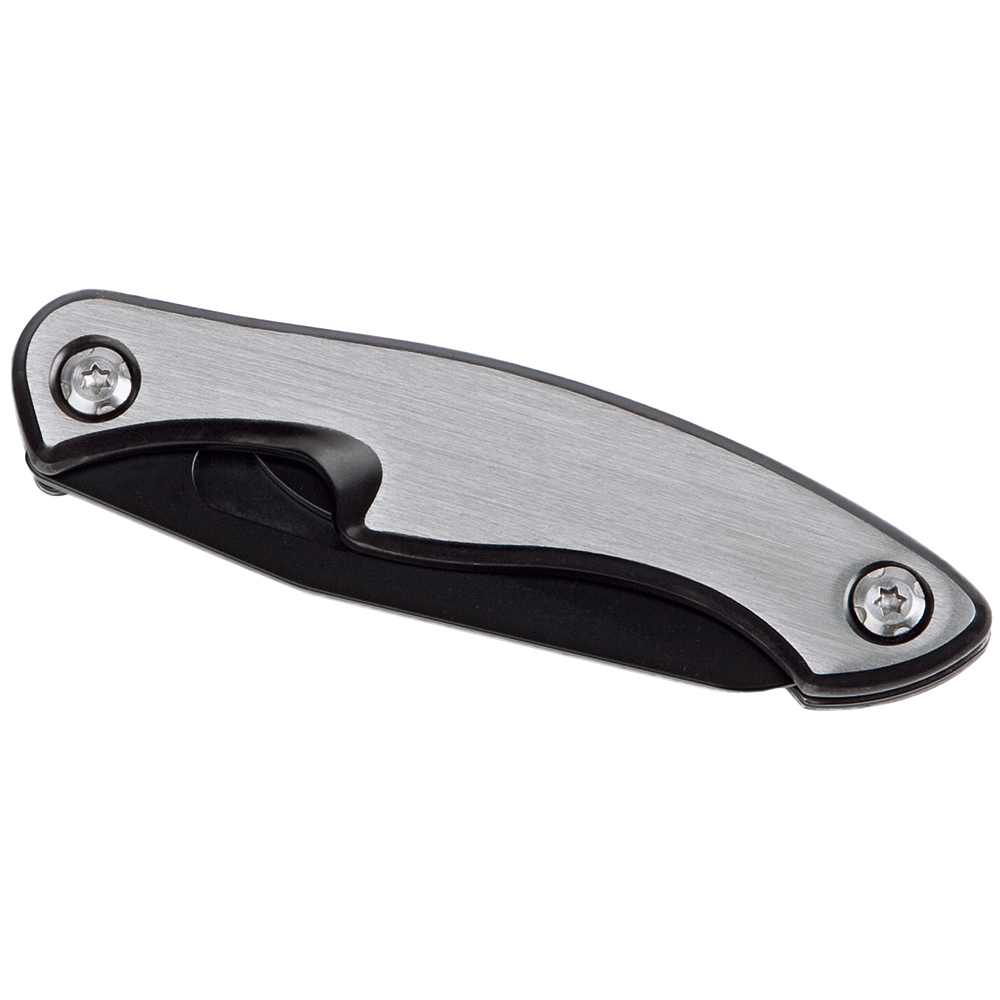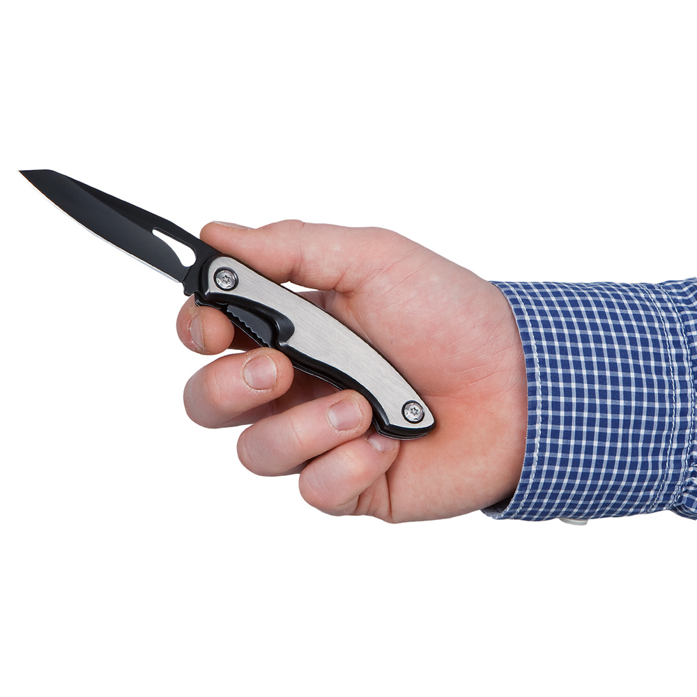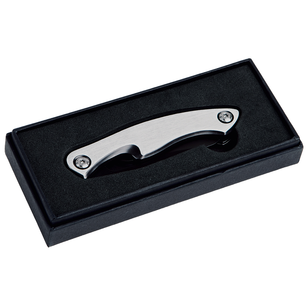 Edles Taschenmesser mit Klingenarretierung und hochwertigen Griffschalen aus gebürstetem Edelstahl. Durch den Feststellmechanismus wird die Klinge in der Arbeitsposition arretiert und garantiert somit eine sichere Handhabung. Für Rechts- und Linkshänder geeignet. Material: Edelstahl Griffschale gebürstet mit schwarz beschichtetem Dekorrand. Klinge: 3Cr13 Edelstahl schwarz beschichtet, Klingenlänge 75 mm. Funktionen: Feststellmechanismus für die Klinge. Verpackung: hochwertige Karton-Geschenkverpackung.