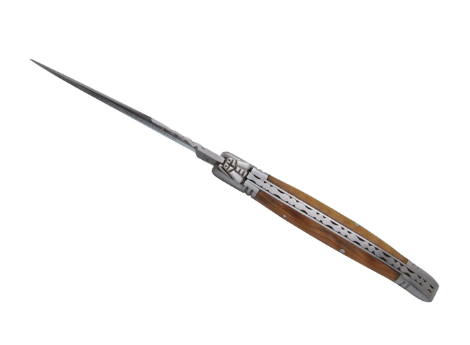 Klappbares Messer, das gemäß sehr strengen Spezifikationen hergestellt wurde: Klinge aus rostfreiem 440er Edelstahl, auch als 'chirurgischer Stahl' bezeichnet. Er bietet eine perfekte Kombination aus Chrom (das vor Rost schützt) und Kohlenstoff (das für Schärfe sorgt). Rasiermesserscharfe Klinge. Griff aus Olivenholz. Zwei geschmiedete Heftbacken aus rostfreiem Edelstahl. Verzierte Feder. Dieses Modell ist zudem mit einem Motiv des Hirtenkreuzes verziert. Wird in einem melierten grauen Etui aus RPET geliefert. Die Vorteile in Kürze: - Eine sehr harte Klinge aus 440er Edelstahl, die eine sehr gute Oxidationsbeständigkeit gewährleistet und wenig Nachschärfen benötigt, um die Schärfe zu erhalten. - Ein Klapp- und Schließmechanismus (frz. mécanisme à cran forcé), das bei den meisten klassischen Messern verwendet wird. - Ein Griff aus Olivenholz für Eleganz und Authentizität. - Wird mit einem Etui aus RPET (recycelte Verpackung) geliefert, anstatt einer wegwerfbaren Kartonverpackung.