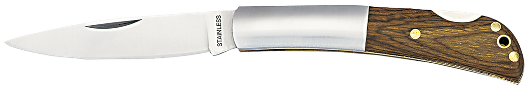 Taschenmesser mit Klinge aus Edelstahl und Griff aus einer Kombination von Naturholz und Edelstahl. Mit Sicherheitsverschluss und Stanzung am Griff. Präsentiert in einer individuellen Box.