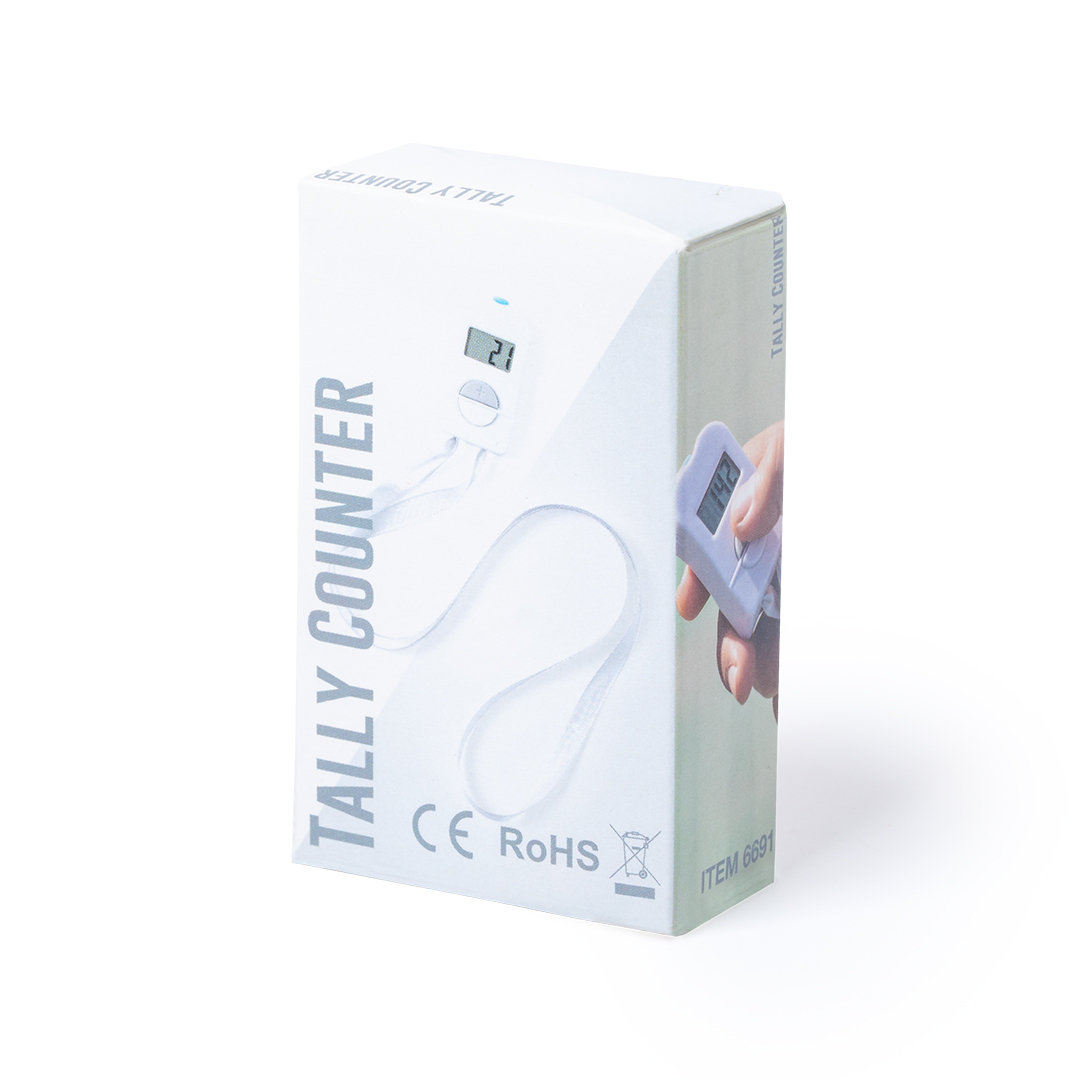 Digitaler Handkontrollzähler, hergestellt aus haltbarem ABS-Material mit glänzender Oberfläche. Praktisches Polyester-Lanyard und breite Zählerknöpfe zum Hinzufügen oder Entfernen von Zählwerten. Digitaler LCD-Bildschirm mit 4-stelligem Zählwerk und Reset-Taste an der Oberseite. Große Werbefläche, speziell für den Tampondruck ausgelegt. Präsentiert in einer attraktiven Design-Box. Batteriebetrieben, inklusive Knopfbatterie.