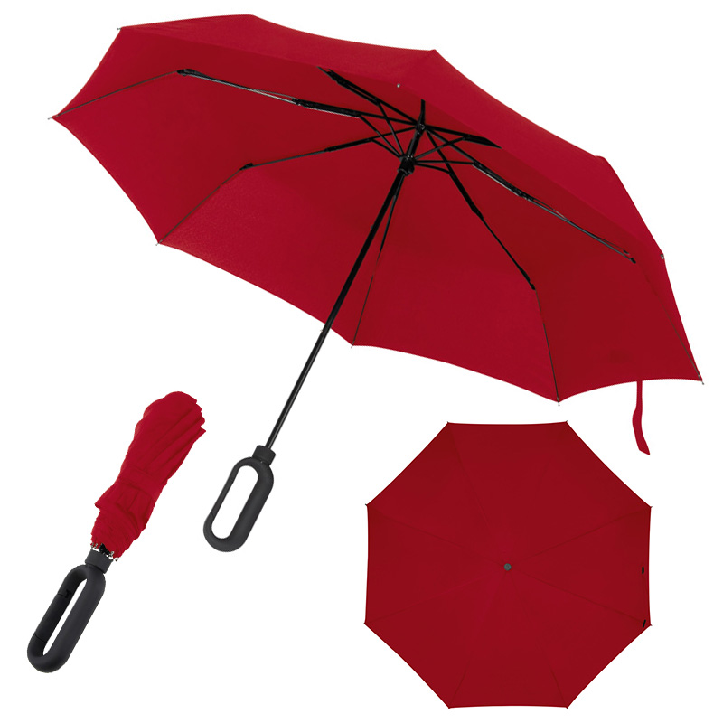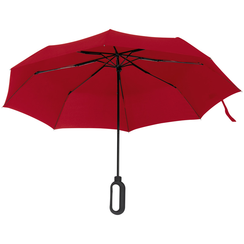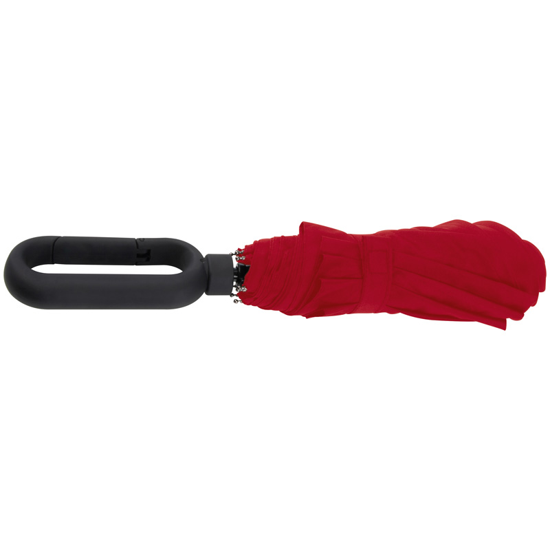Eleganter Taschenschirm mit 190T-Pongeebespannung und gummiertem Karabinergriff. Ihre Werbung drucken wir auf ein Segment.