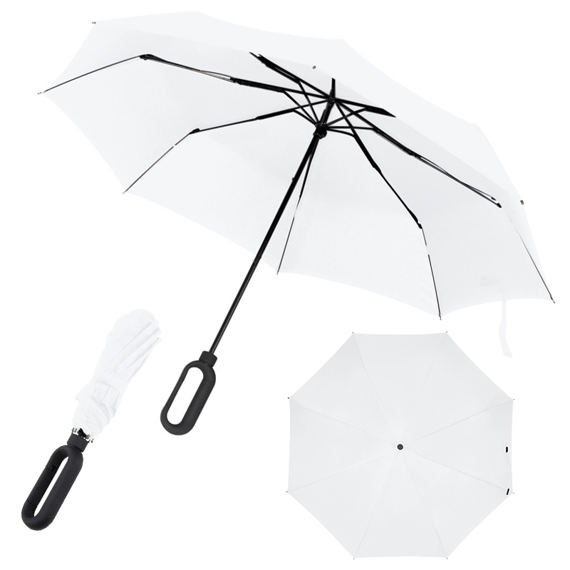 Eleganter Taschenschirm mit 190T-Pongeebespannung und gummiertem Karabinergriff. Ihre Werbung drucken wir auf ein Segment.