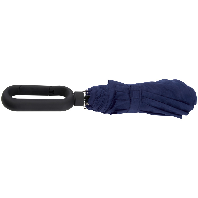 Eleganter Taschenschirm mit 190T-Pongeebespannung und gummiertem Karabinergriff. Ihre Werbung drucken wir auf ein Segment.