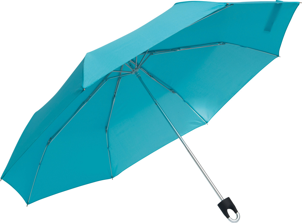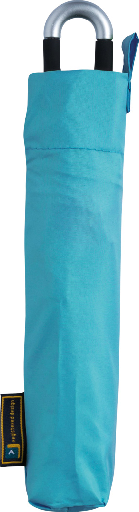 Taschenschirm TWIST mit im Griff integrierter Aufhängefunktion: 204g-leichtes Gestell, 3-teiliger Aluminiumstock, Aluminium- / Fiberglasspeichen, Metalltips, gummierter Griff, Polyester-Pongee-Bespannung und -Hülle, Schließband mit Klettverschluss