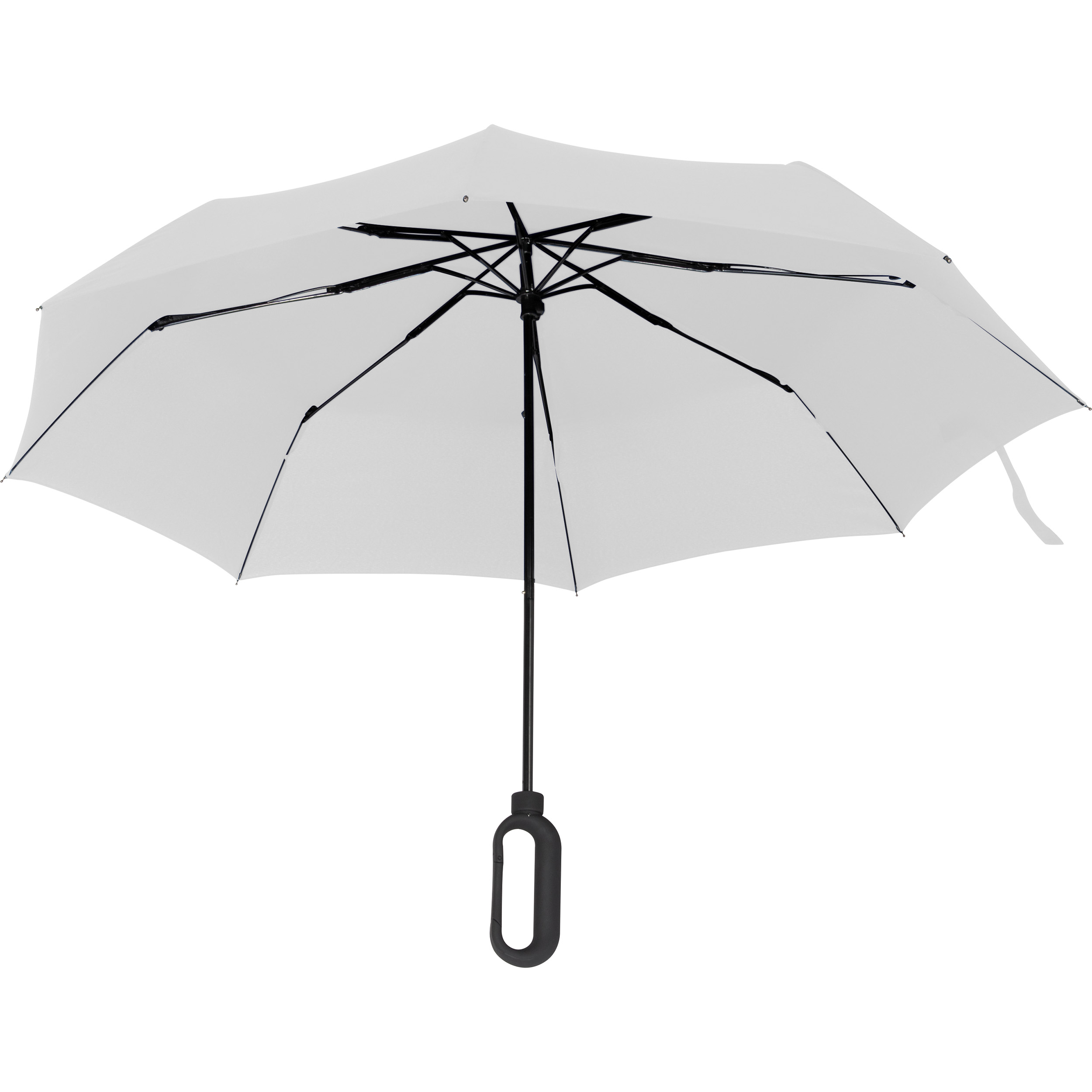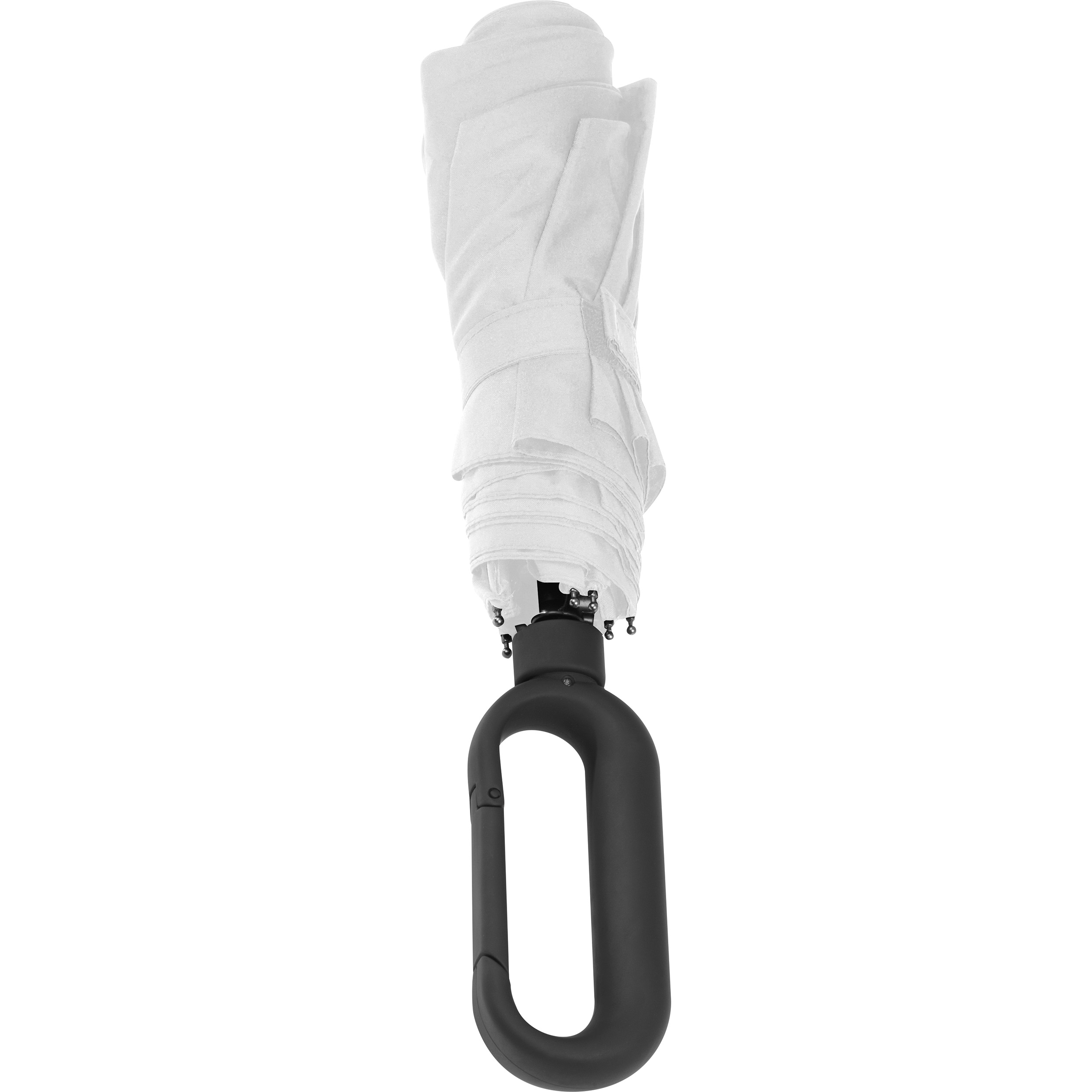 Taschenschirm aus 190T Pongee mit gummiertem Griff in Karabinerform, durch den sich der Schirm überall befestigen lässt. Ihre Werbung wird auf ein Segment des Schirms gedruckt.