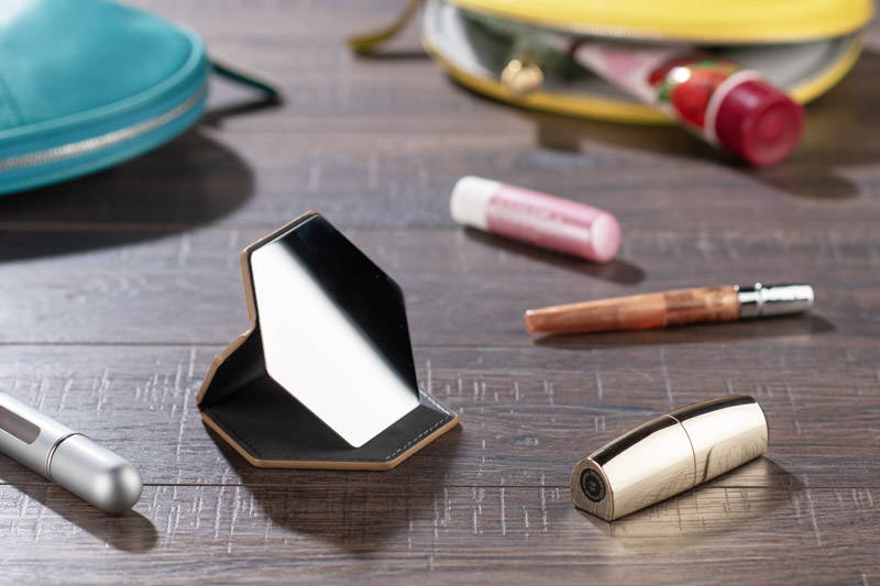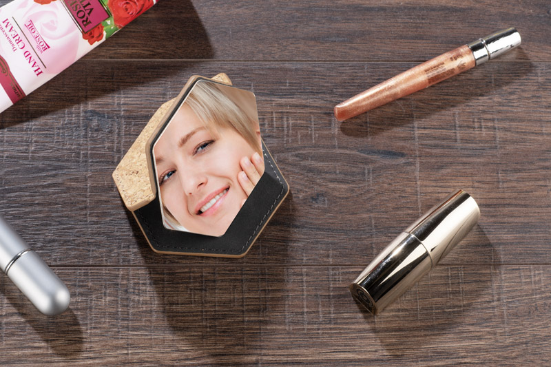 Entdecken Sie den Taschenspiegel SARI. Das sechseckige Gehäuse aus Kork verleiht dem Spiegel ein modernes, umweltfreundliches Aussehen und hebt ihn von anderen Accessoires ab. Sie können den SARI auf eine flache Oberfläche stellen und Ihr Make-up oder Ihr Aussehen bequem auffrischen, wo immer Sie sind. Dank seiner kompakten Größe passt der SARI-Spiegel in jede Handtasche.
