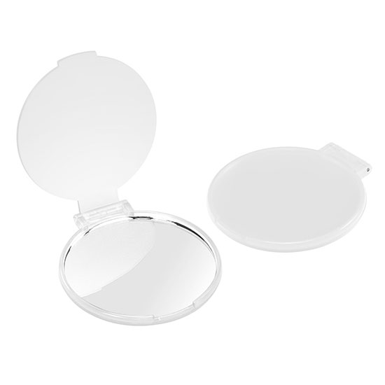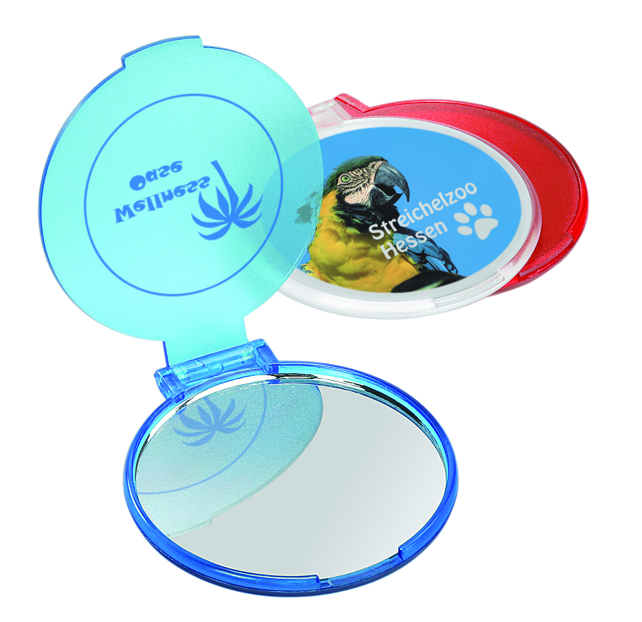 Taschenspiegel, rund mit aufklappbarem Deckel, der auch als Spiegelständer zu nutzen ist