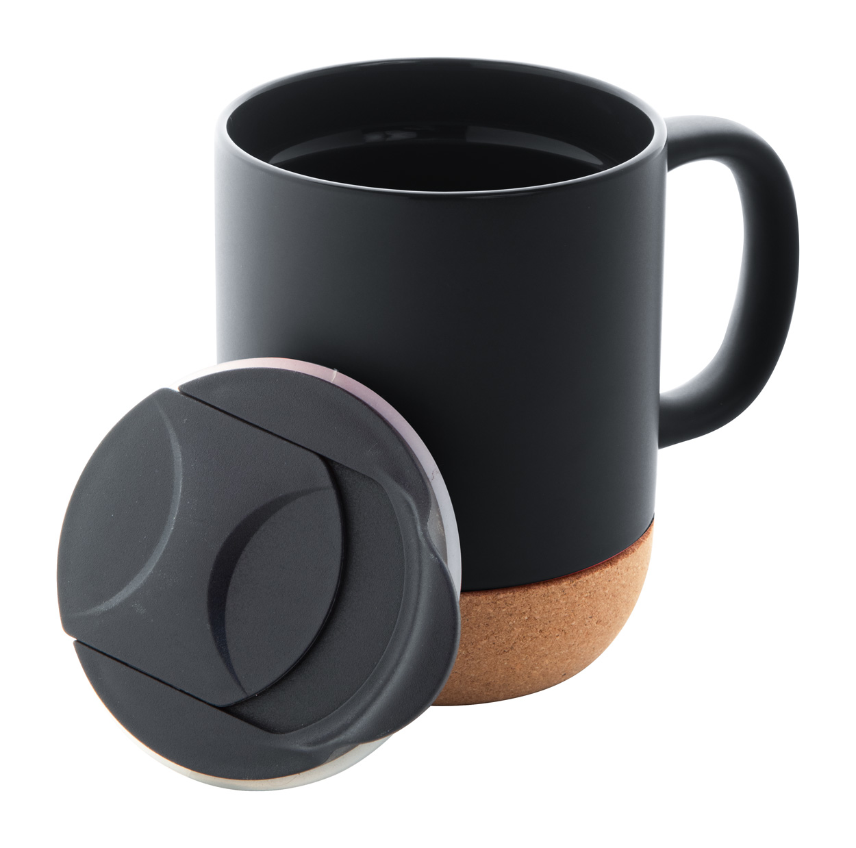 Hochwertige Keramiktasse mit Naturkorkboden und Trinkdeckel aus PP Kunststoff. Die Tasse hat außen eine matte und innen eine glänzende Oberfläche. Füllmenge: 325 ml. Einzeln in Kraftpapierbox.