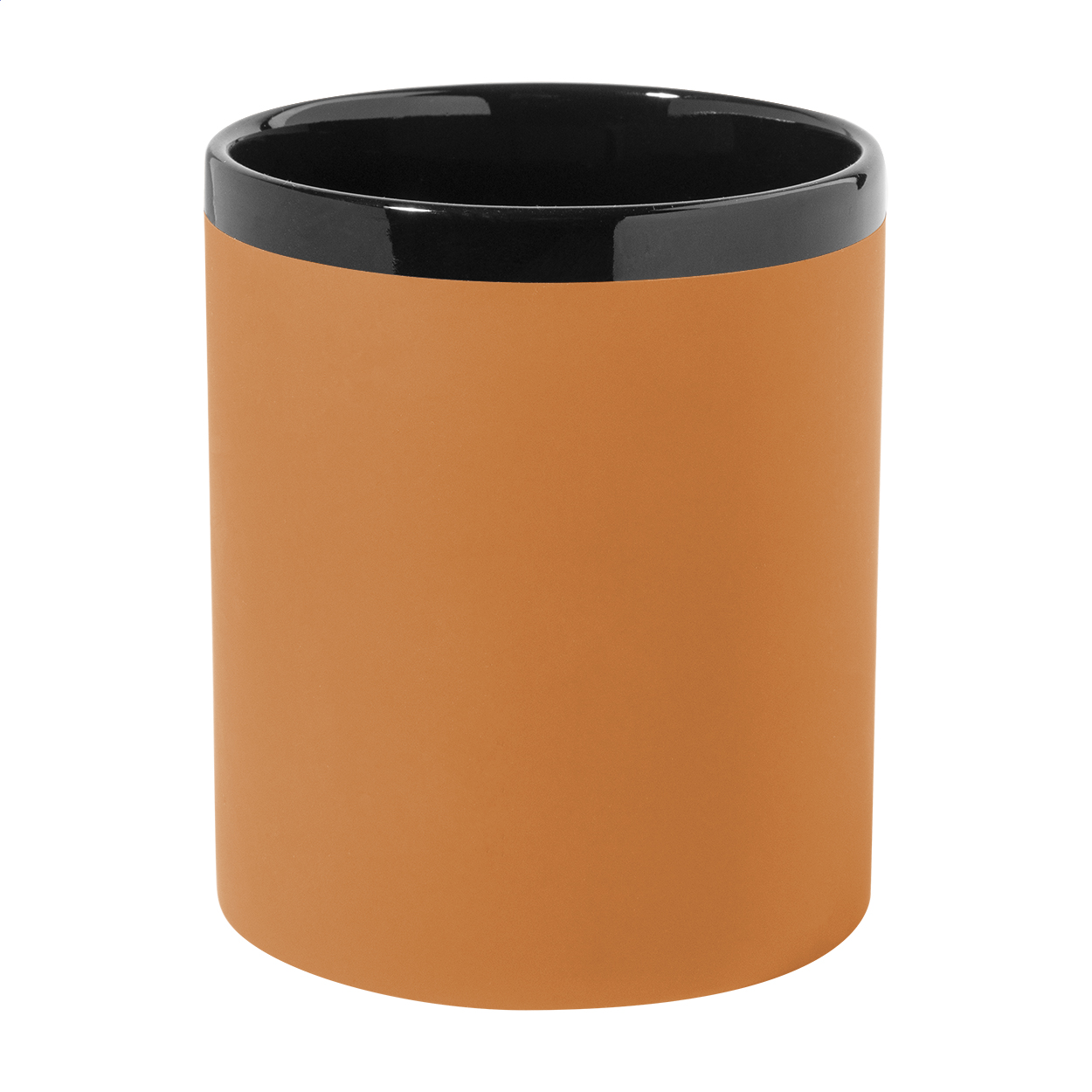 Keramiktasse mit gummierter Soft-Touch-Oberfläche und schwarzer Innneseite und Trinkrand. Mit Spezialbeschichtung für Gravuren (Gravurfarbe abgestimmt mit der Innenfarbe). Füllmenge: 300 ml. Einzeln in Kraftpapierbox.