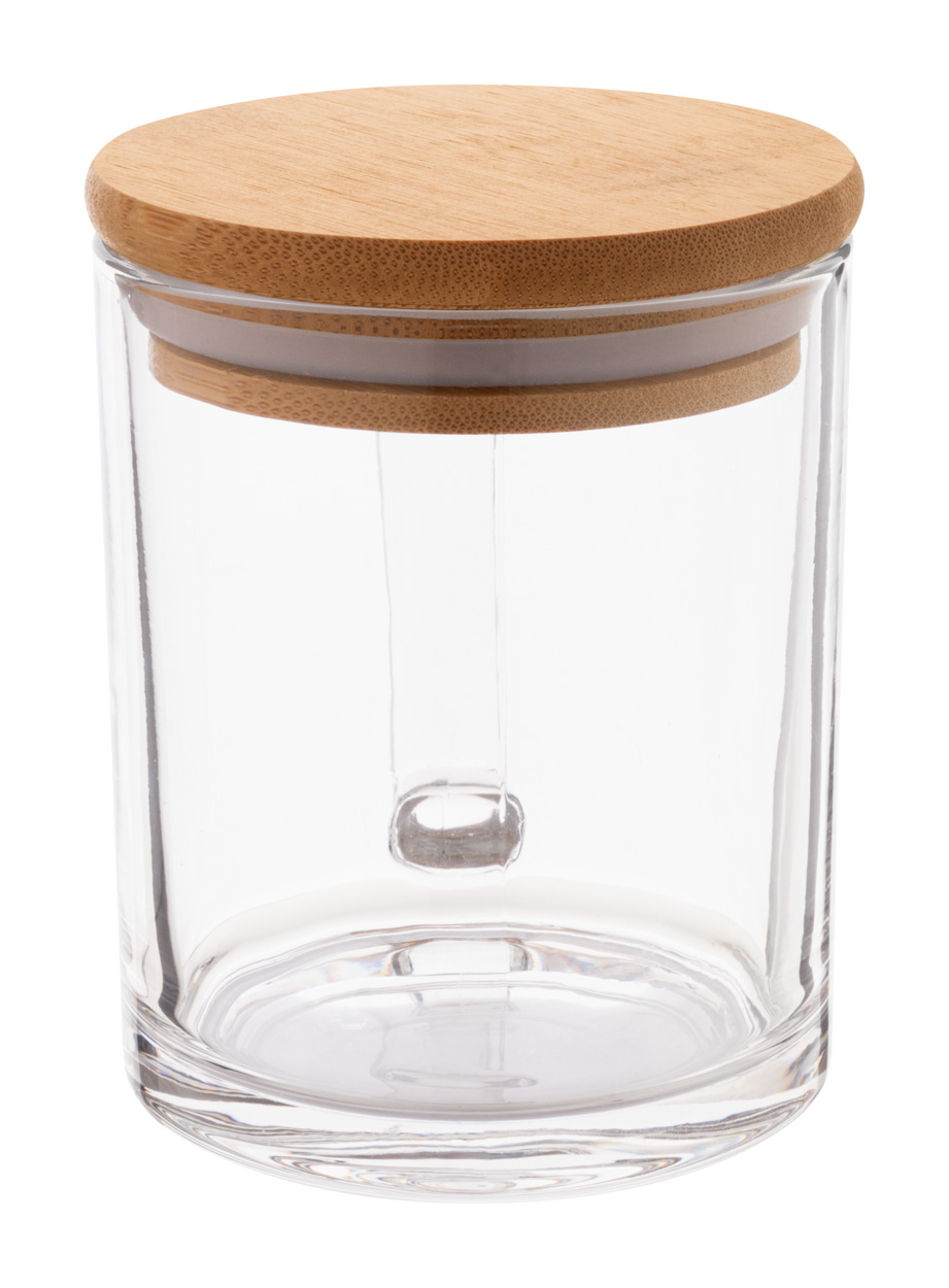 Tasse aus recyceltem Glas mit Bambusdeckel. Füllmenge: 300 ml. Einzeln in Kraftpapierbox.