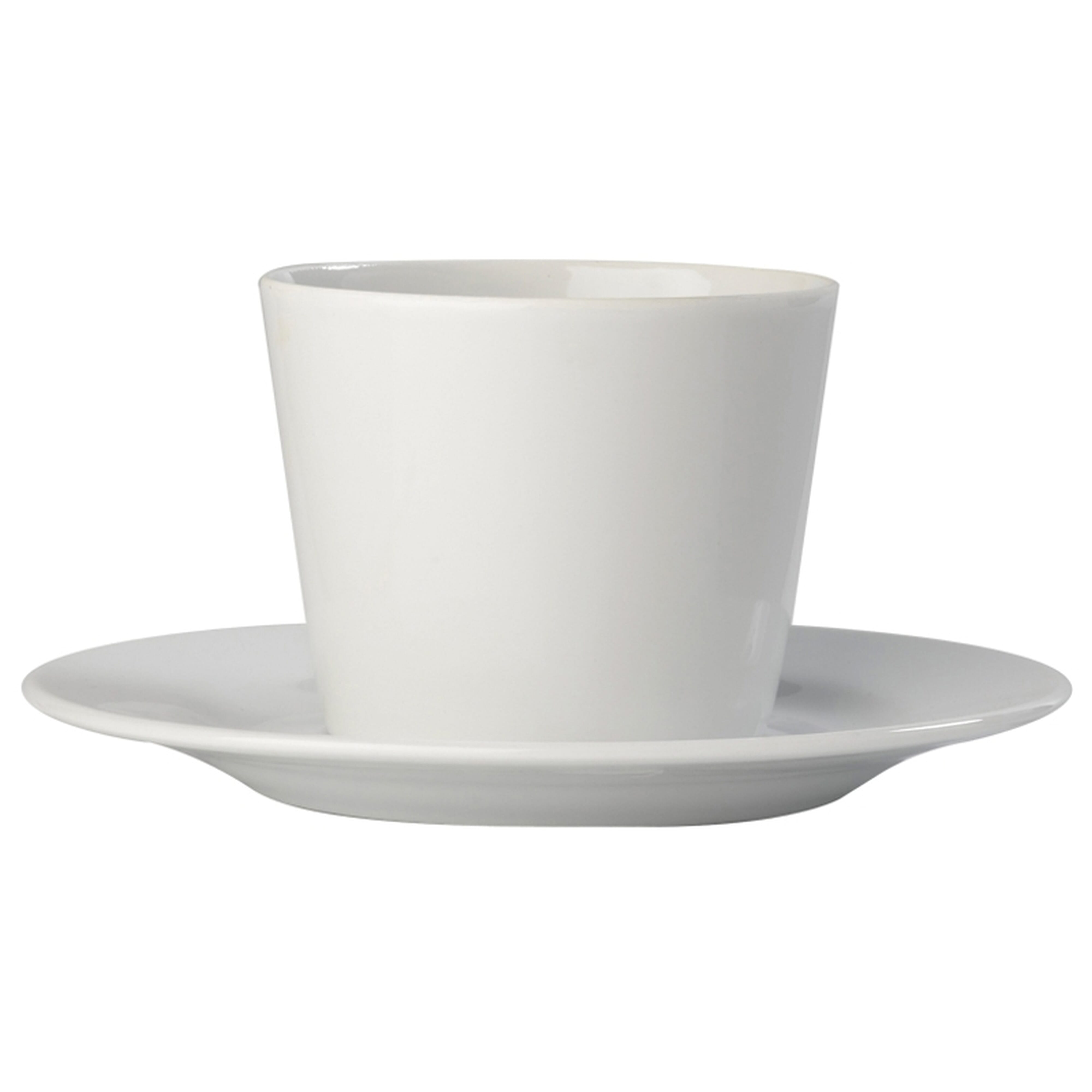 Kaffeetasse mit Untertasse aus hochwertigem Porzellan im schlichten, konischen Design. Standard Werbeanbringung auf der Tasse.