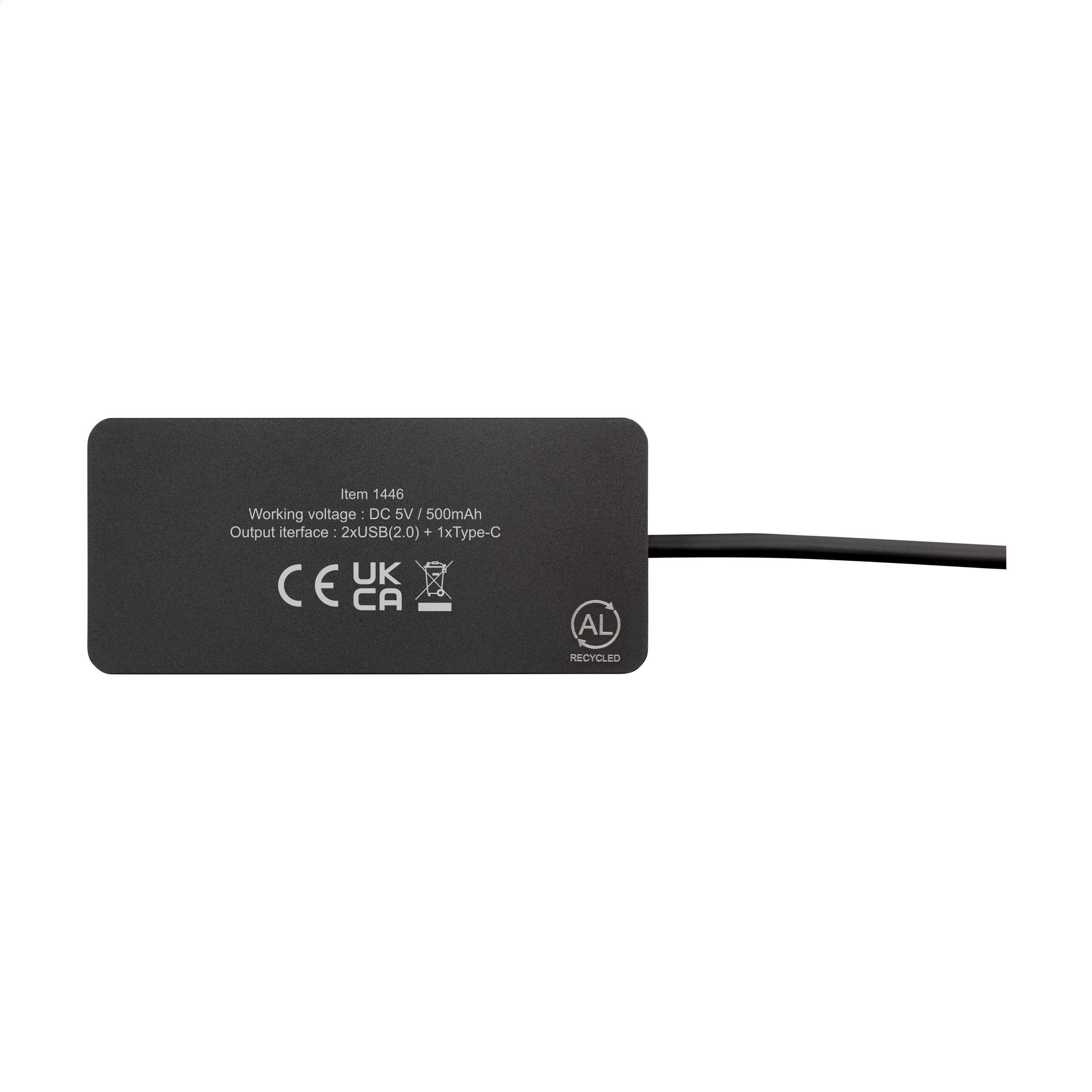 Kompakter, leichter 2.0-USB-Hub. Das Gehäuse ist aus 100% GRS-zertifiziertem, recyceltem Aluminium gefertigt. Ausgestattet mit 3 USB-Anschlüssen: 1 USB-A 2.0-Anschluss und 2 Typ-C-Anschlüsse zum Anschluss weiterer Geräte. Mit einem schwarzen Kabel, das mit einem dualen Eingangsstecker ausgestattet ist, der sowohl für Typ-C- als auch für USB-A-Computer geeignet ist. Gesamtes recyceltes Material: 50%. Durch die Verwendung von recyceltem Aluminium werden bei der Herstellung dieses Produkts weniger neue Rohstoffe verwendet. Das bedeutet weniger Energieverbrauch und weniger Wasserverbrauch.