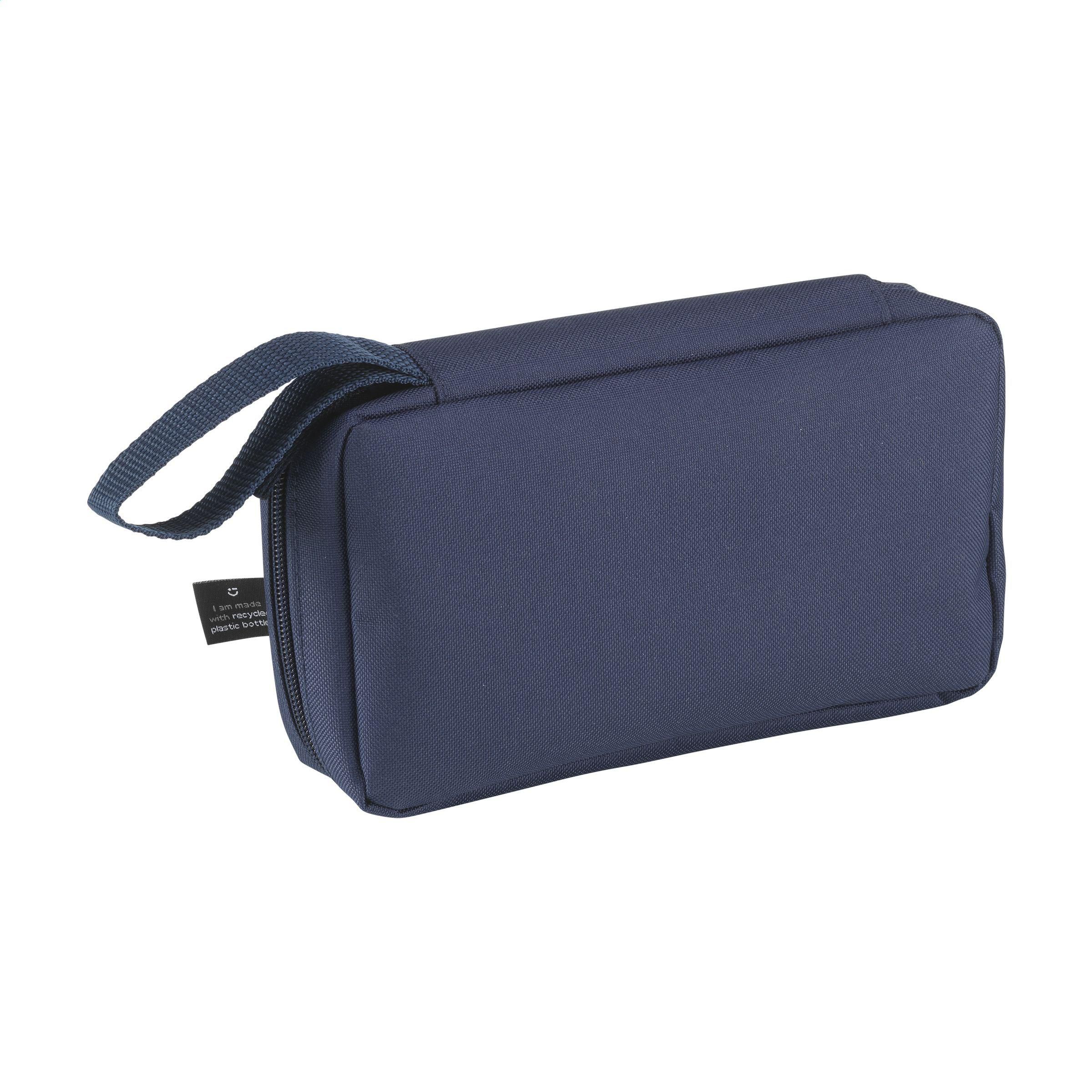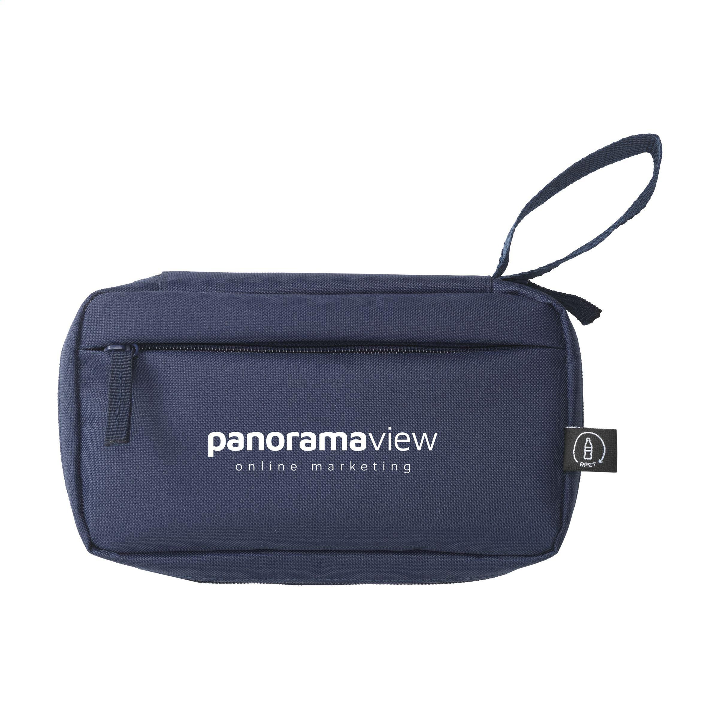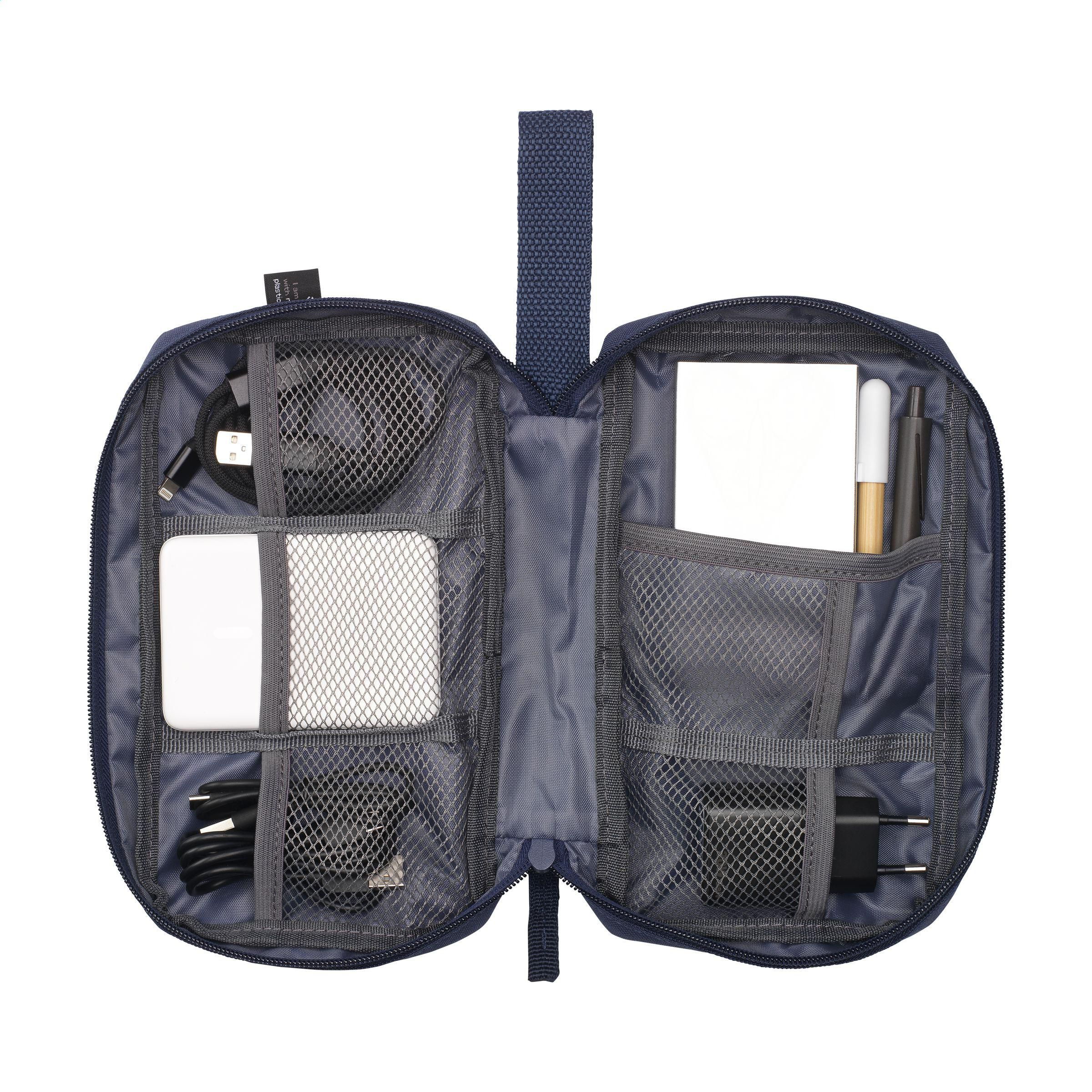 Etui zur geordneten und übersichtlichen Aufbewahrung von Kabeln, Ladegeräten und technischem Zubehör. Hergestellt aus 600D RPET-Polyester. Das Innere bietet reichlich Stauraum, unterteilt in mehrere (Netz-)Fächer. Mit Reißverschluss, einer zusätzlichen Reißverschlusstasche an der Außenseite und einer praktischen Trageschlaufe. Ideal für Reisen, aber auch praktisch für zu Hause oder im Büro. GRS-zertifiziert. Gesamtes recyceltes Material: 88%.