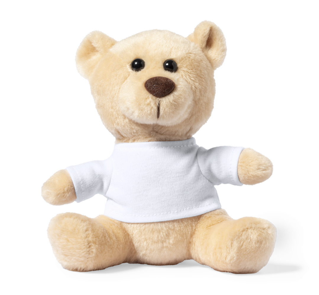 Weicher und kuscheliger Teddybär, erhältlich in Natur- und Brauntönen. Mit abnehmbarem weißem T-Shirt zum einfachen Bedrucken.