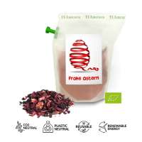 Standbeutel Mini aus Kraftpapier. Werbeanbringung als Etikett in 4c individuell bedruckbar. Zutaten Bio Kräutertee Vierjahreszeiten: Lemongras*, Hibiskus*, Hagebutten*, Kamillenblüten*, Melisse*, Pfefferminz; *aus kontrolliert...
