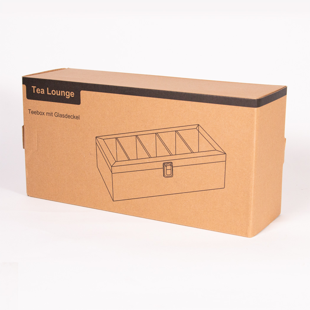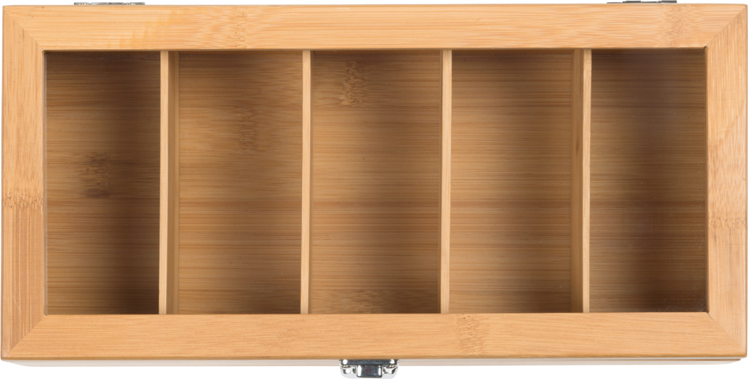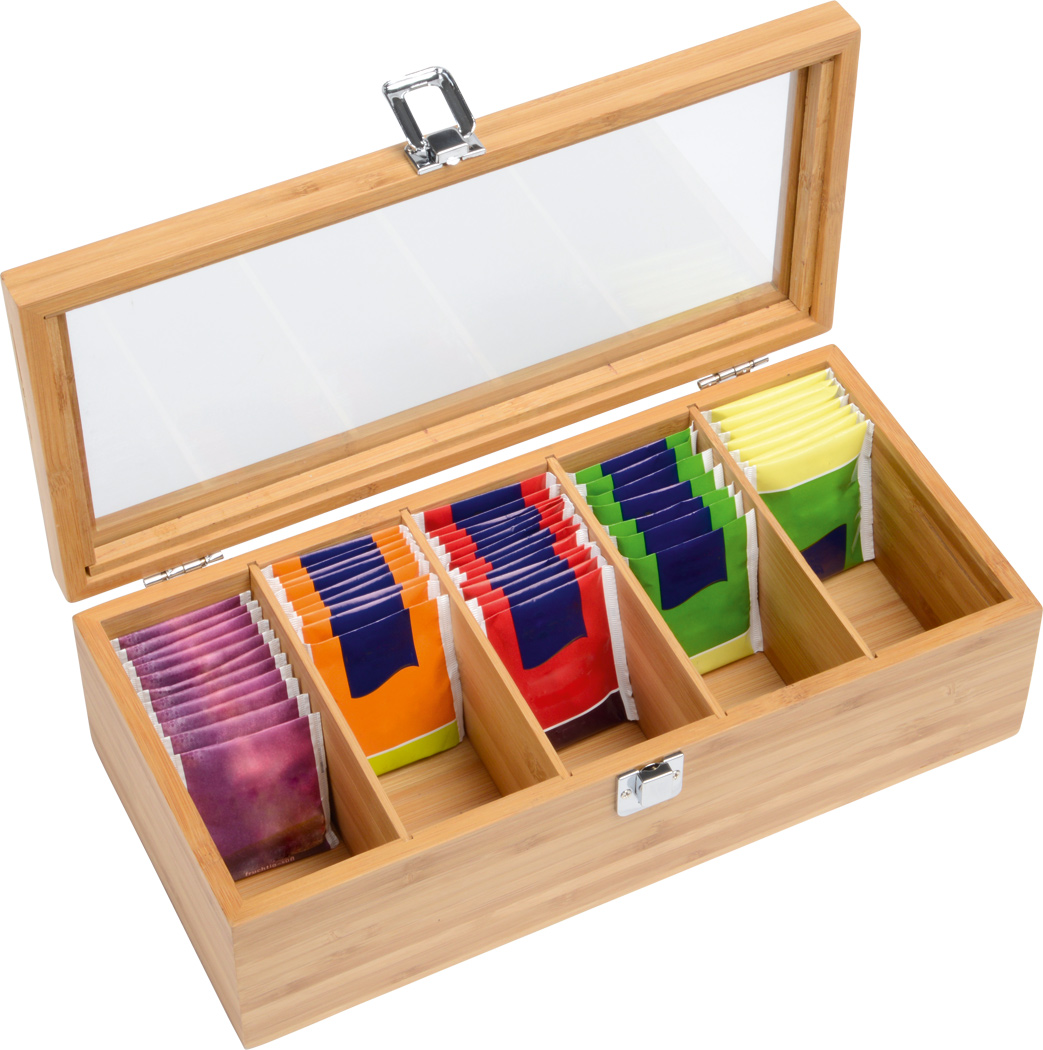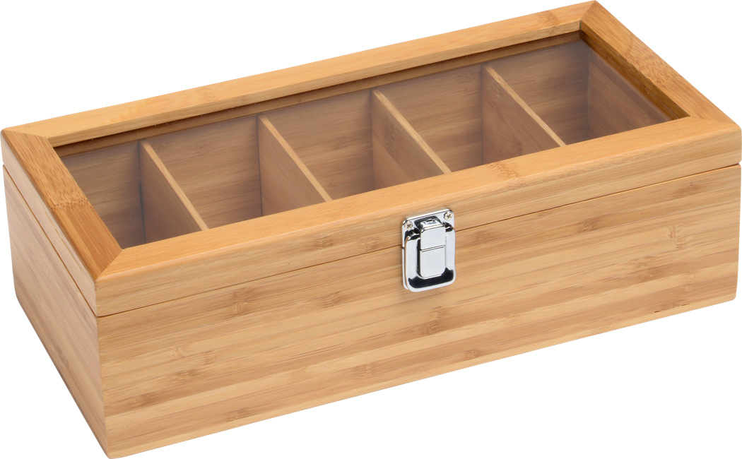 Teebox TEA LOUNGE: aus Bambus, mit 5 getrennten Fächern zum Befüllen mit Teebeuteln, mit Sichtfenster aus Glas im Deckel und Schnappverschluss, in Box