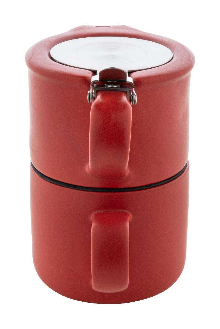 Hochwertiges Teeservice aus Keramik mit matter Oberfläche. Enthält eine Teekanne (430 ml) mit Edelstahldeckel und Teesieb, die sich perfekt auf die passende Tasse (400 ml) stapeln lässt. Einzeln in einer Kraftpapierbox.