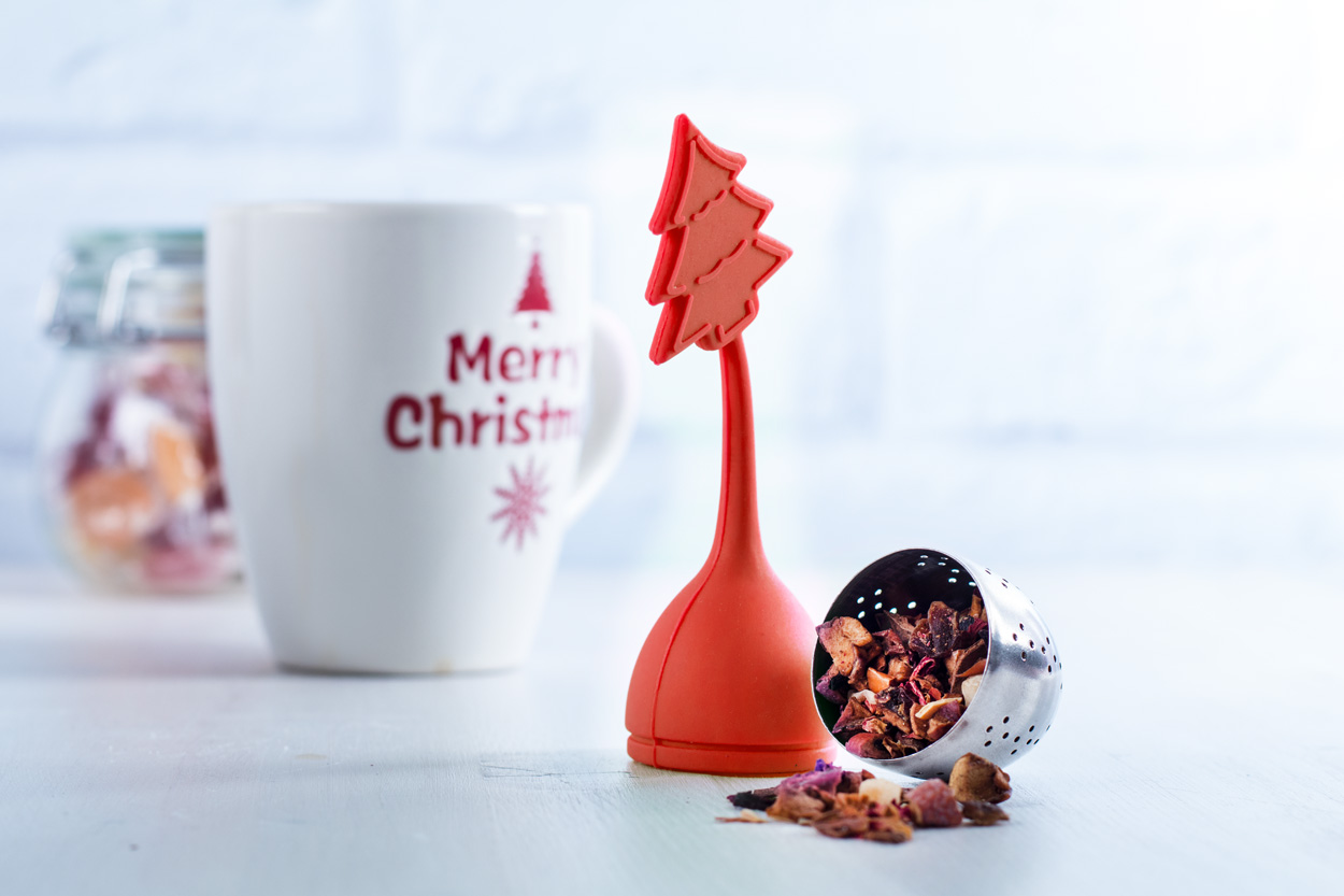 Teesieb aus Silikon und Edelstahl im Weihnachtsdesign.
