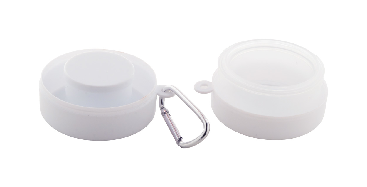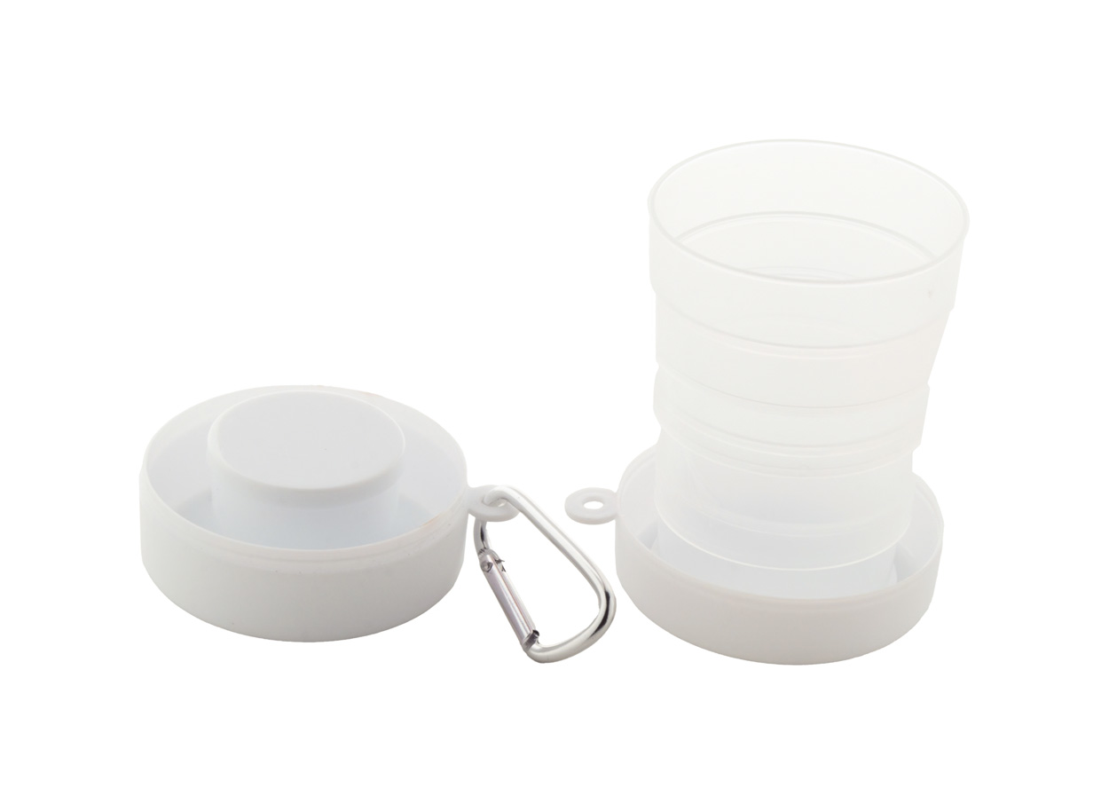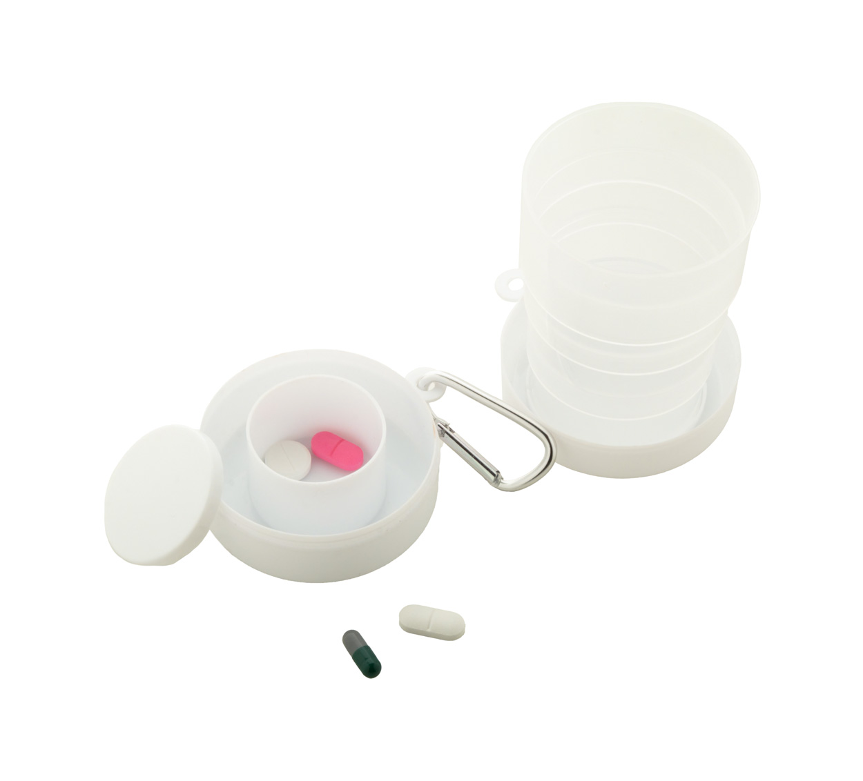 Faltbarer Becher aus recyceltem PP-Kunststoff mit Pillendosefach und Metallkarabiner. Füllmenge: 220 ml. BPA-frei.