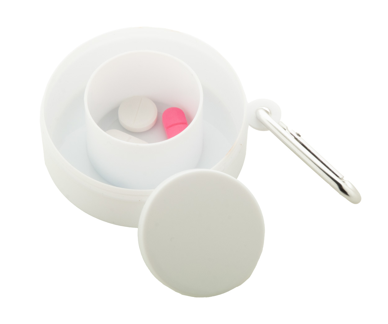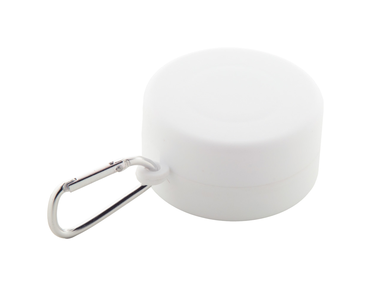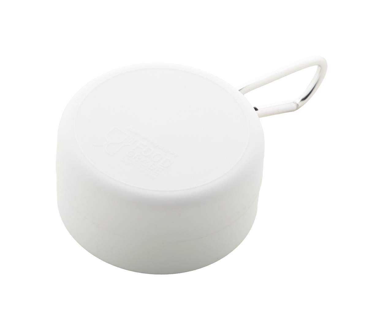 Faltbarer Becher aus recyceltem PP-Kunststoff mit Pillendosefach und Metallkarabiner. Füllmenge: 220 ml. BPA-frei.