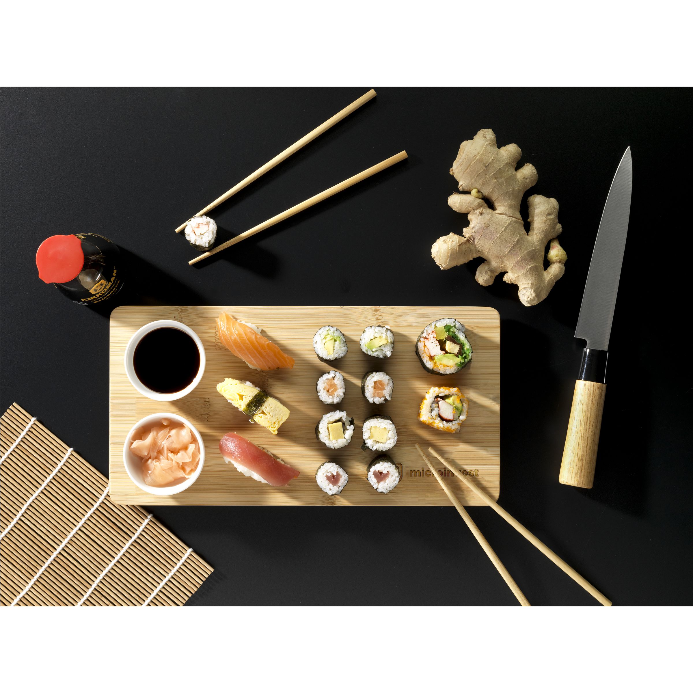 WoW! Komplettes Sushi-Servier-Set bestehend aus: Sushi-Tablett aus Bambus auf Beinen, 2 Sets Bambus-Essstäbchen und 2 Keramikschalen (Ø 7 cm). Mit diesem Set servieren Sie Sushi mit Stil. Bambus ist hygienisch, antibakteriell und leicht zu reinigen. Wird pro Set in einem Krafkarton geliefert.