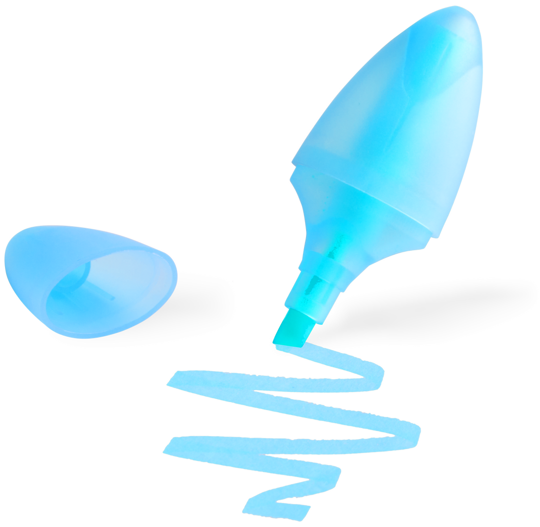Textmarker mit minimalistischem Design in lebhaften Farben. Mit ovalem, transparentem Gehäuse mit Kappe.