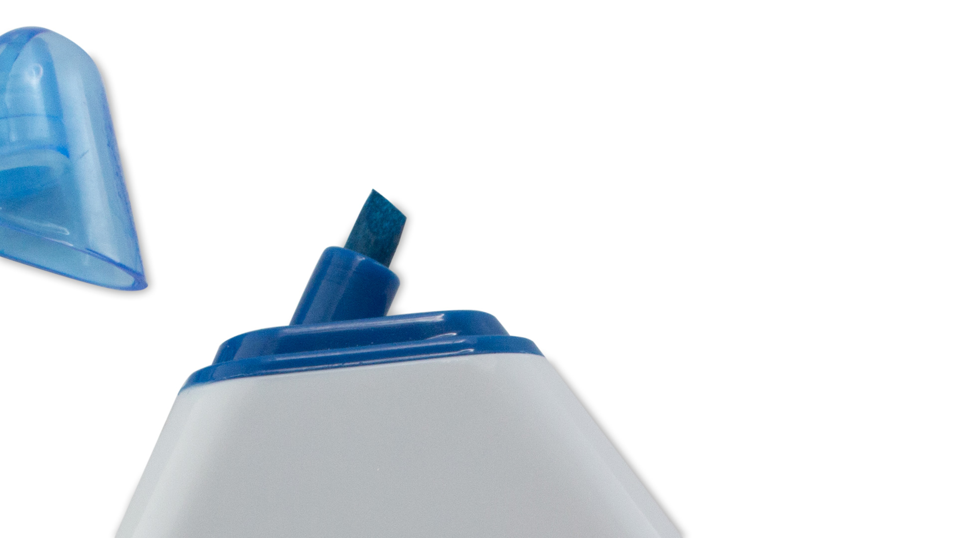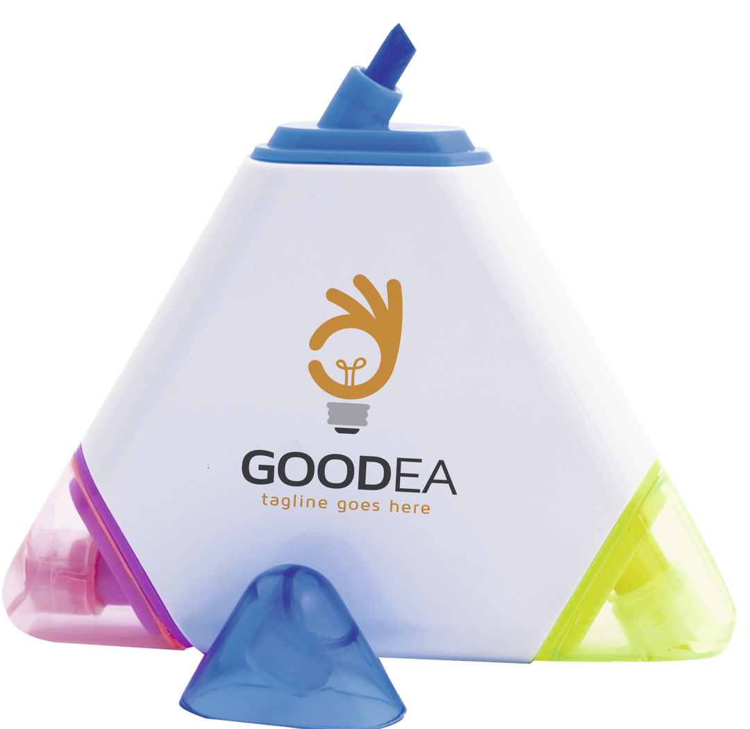 Origineller dreifarbiger Textmarker mit dreieckigem Gehäuse in weißer Hochglanz-Ausführung - speziell geeignet für die Personalisierung mit Vollfarb-Digitaldruck. Mit halbtransparenten, farblich passenden Kappen.