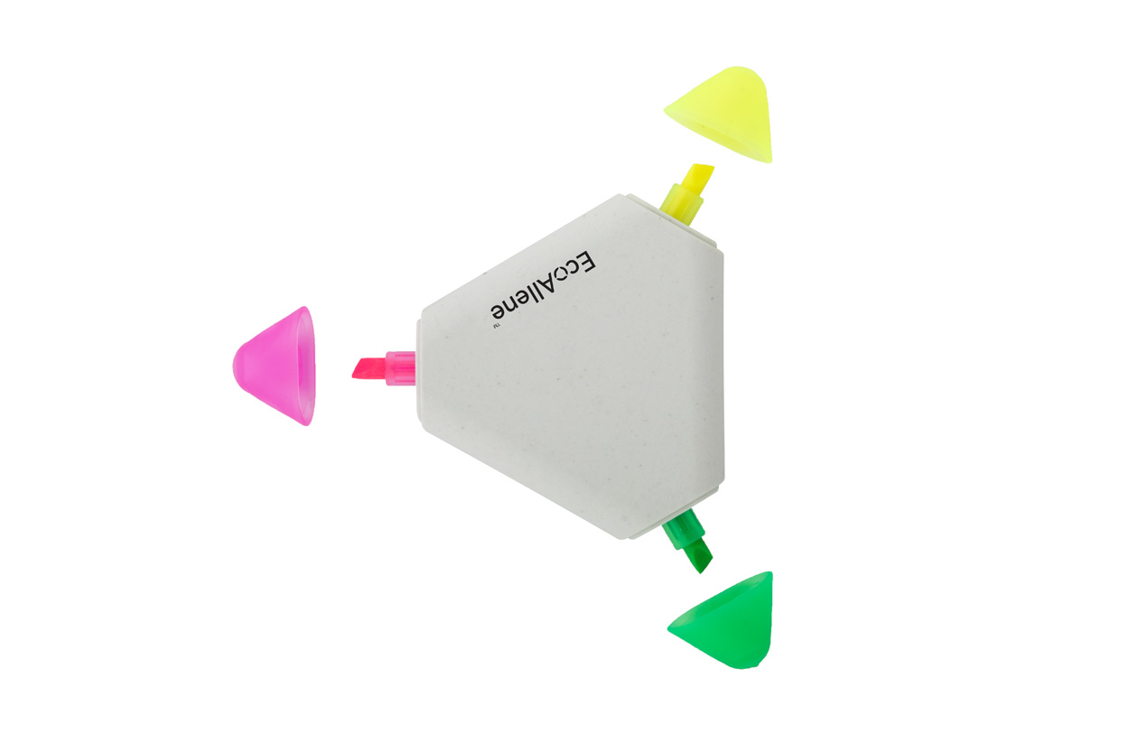 Dreieckiger Textmarker mit 3 Farben aus recyceltem EcoAllene®-Kunststoff. EcoAllene® ist ein neues und innovatives Material, welches aus dem Recycling von Getränkekartons gewonnen wird.