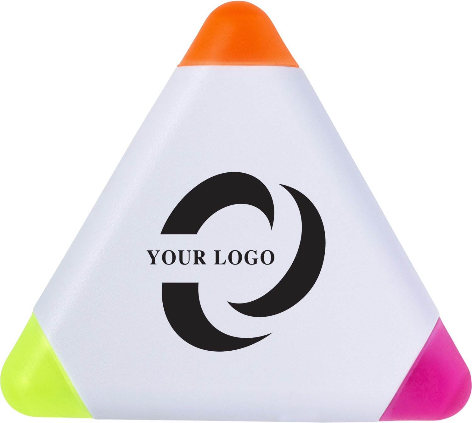 Textmarker 'Triangle' in Form eines Dreiecks aus Kunststoff. Jede Ecke hat eine unterschiedliche Farbe: pink, orange und gelb.