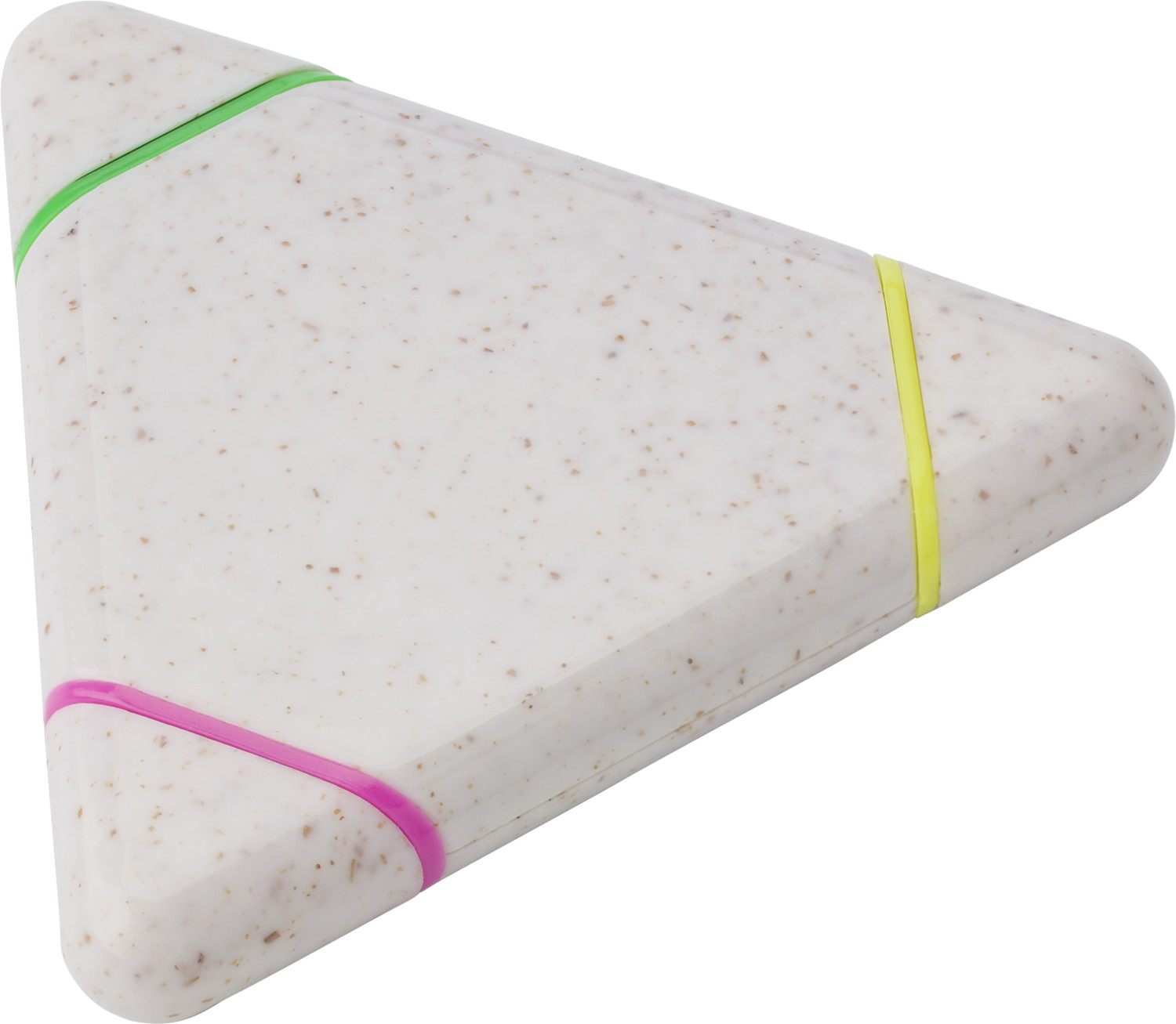 Textmarker aus Weizenstroh mit drei Farben: rosa, grün und gelb.
