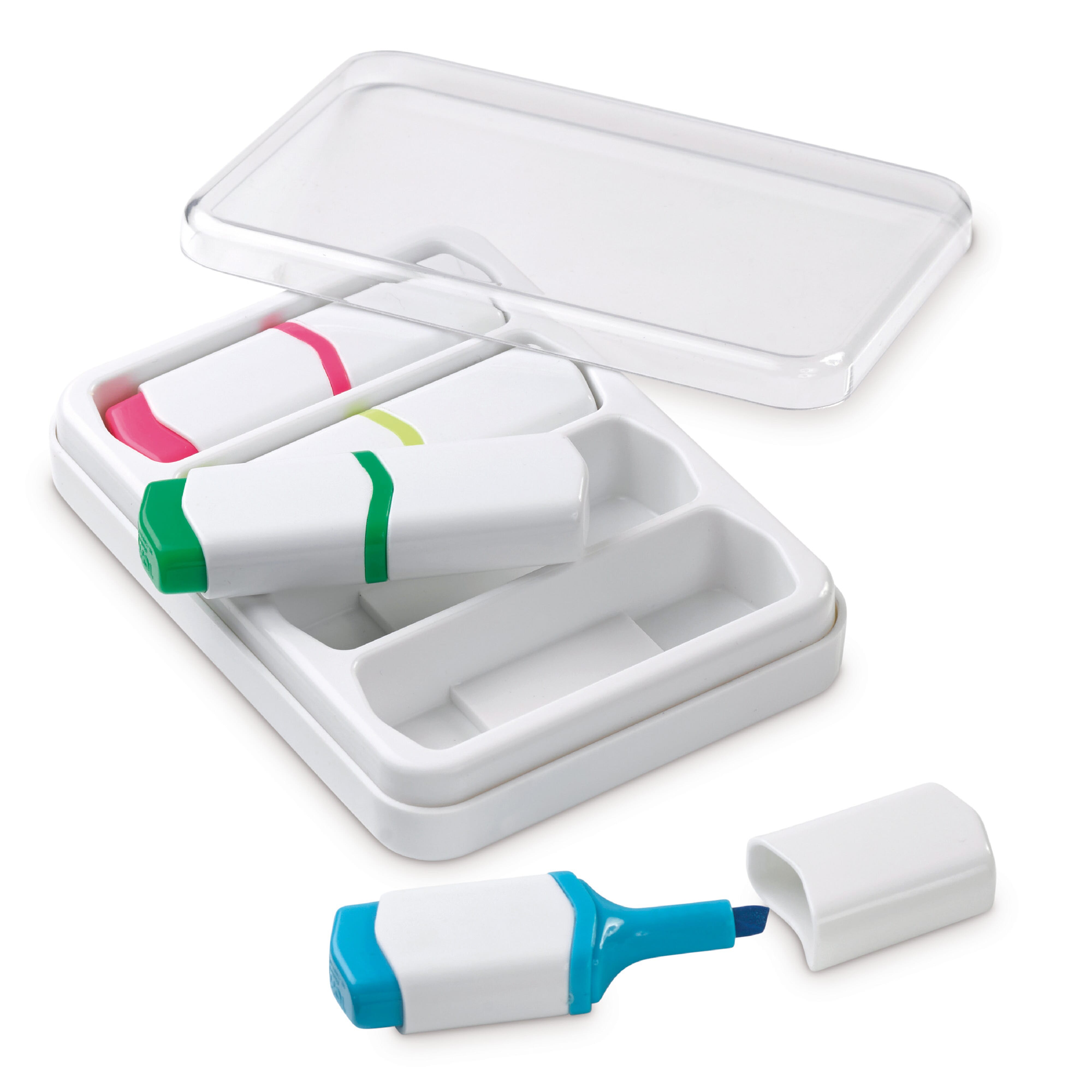 Set mit 4 Mini Textmarkern in einer geeigneten Kunststoffbox mit transparentem Deckel. Die Textmarker sind in einem einzigartigen Toppoint Design. Die farbigen Details am Textmarker zeigen die Schreibfarbe.