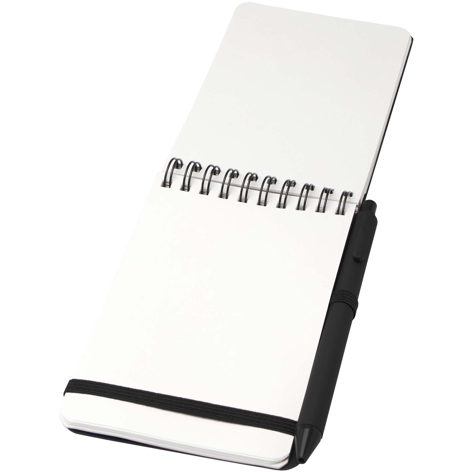 Das Thalaasa A6 Hardcover Notizbuch besteht aus recyceltem ozeangebundenem Kunststoff und umfasst 80 Blatt, liniert, aus cremefarbenem 70 g / m² Papier. Das Notizbuch hat abgerundete Ecken. Es ist mit einem elastischen Verschluss und einer Stiftschlaufe ausgestattet. Der Kugelschreiber mit schwarzer Tinte ist ebenfalls aus recyceltem, ozeangebundenem Kunststoff hergestellt. Schreiblänge: 1000 Meter. Spitzengröße: 1,0 mm.