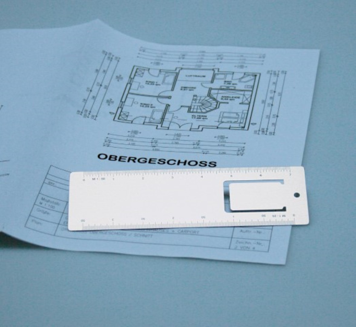 Lesezeichen, Lineal, Mailingartikel und Mega-Werbeträger aus Aluminium. Verschiedenen Maßstäbe 1:1, 1:20, 1:25 und 1:50, VPE 1000. -