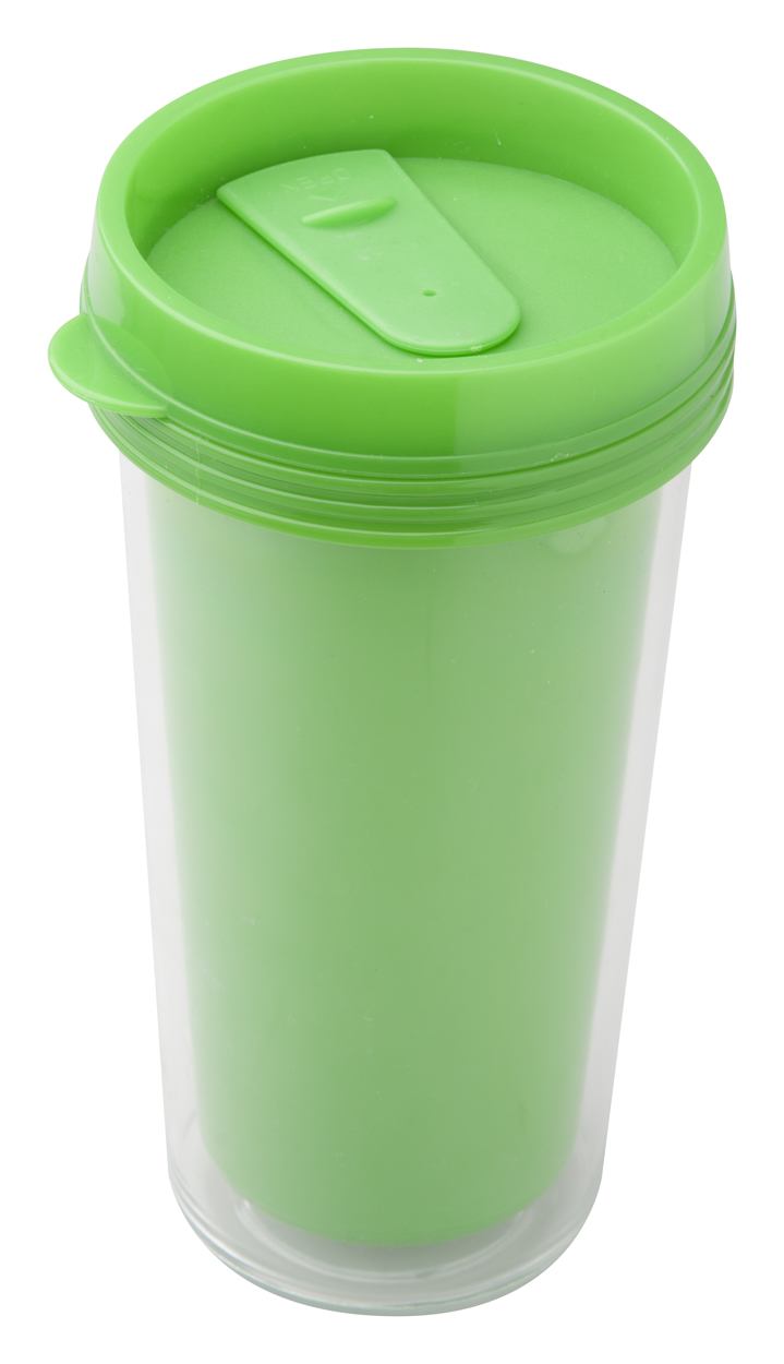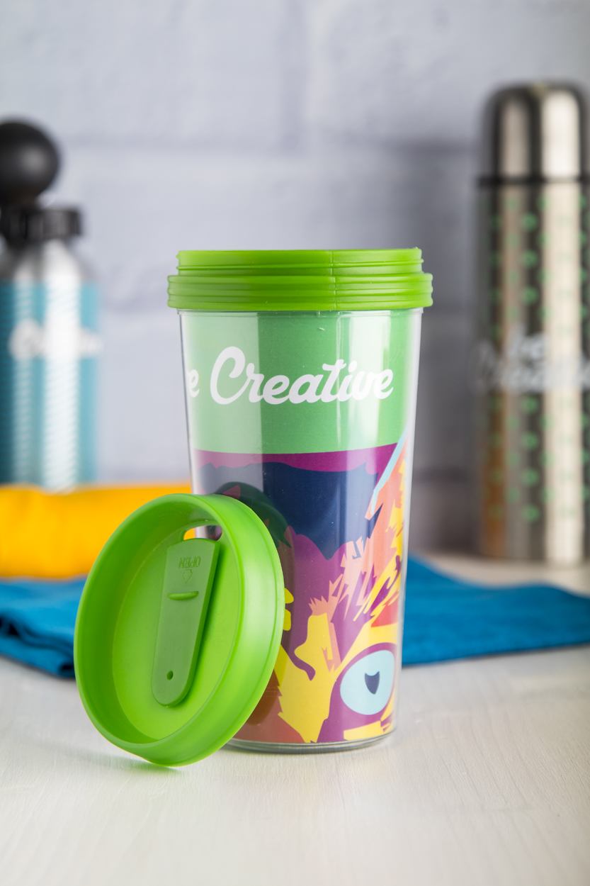 Doppelwandiger Isolierbecher aus Kunststoff für individuellen Papiereinleger. Einzeln in Geschenkbox. Füllmenge: 450 ml.