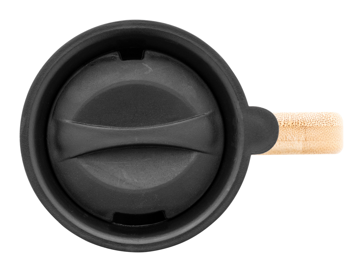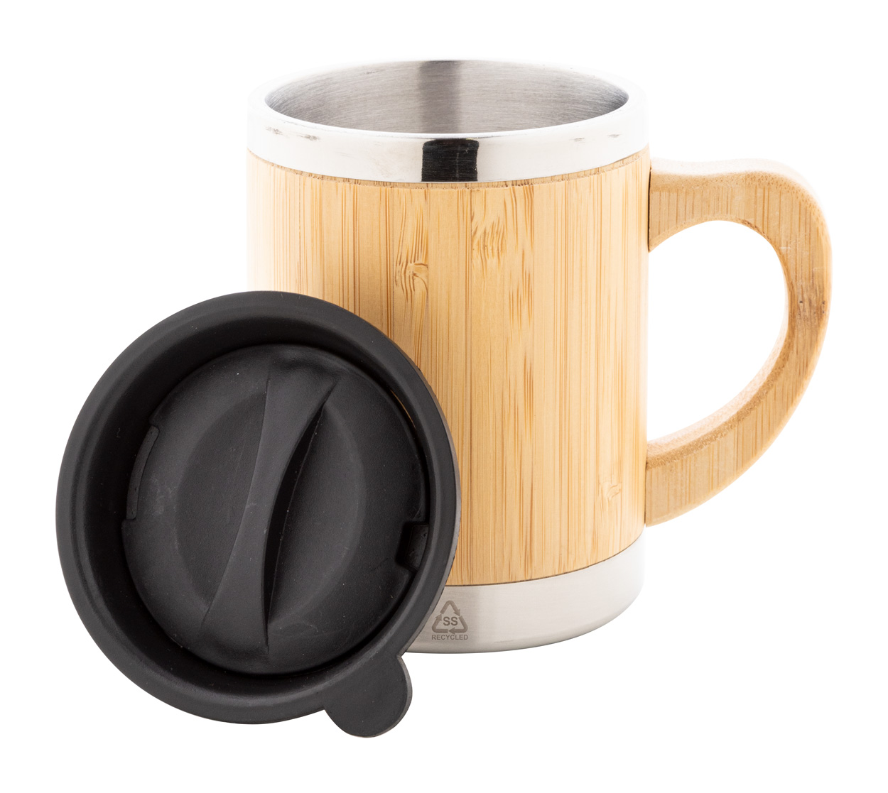 Isolierbecher aus recyceltem Edelstahl mit Bambusüberzug, Bambusgriff und PP-Trinkdeckel, doppelwandig. Füllmenge: 300 ml.