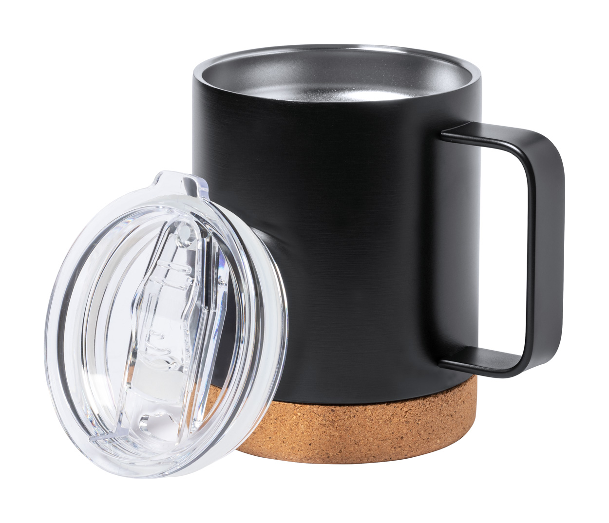 Doppelwandiger Thermobecher aus Edelstahl mit Trinkdeckel und Fuß aus natürlichem Kork, einzeln in Kraftpapierbox. Füllmenge: 330 ml.