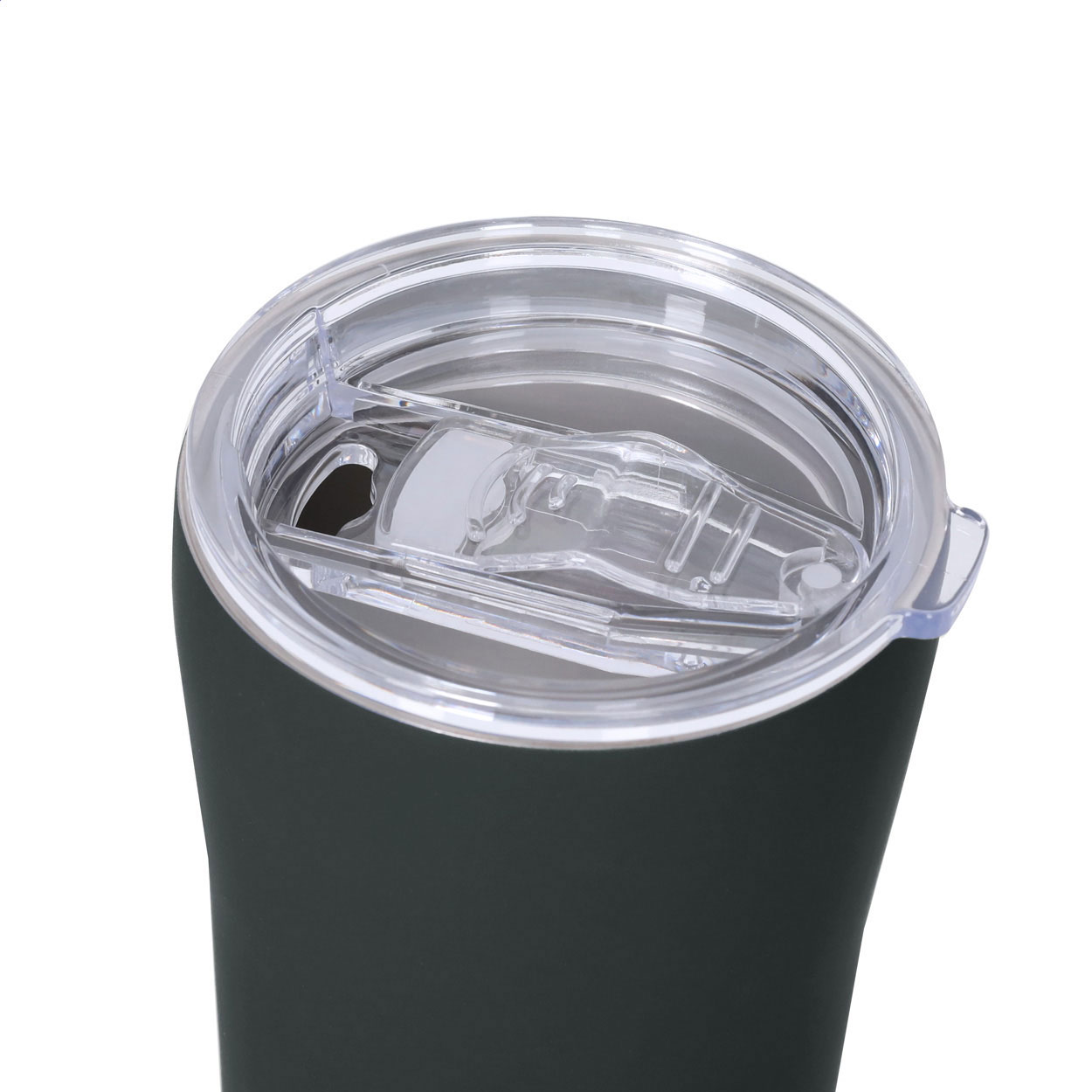 Doppelwandiger Isolier-Thermobecher aus Edelstahl mit gummierter Oberfläche und Trinkdeckel. Füllmenge: 350 ml.