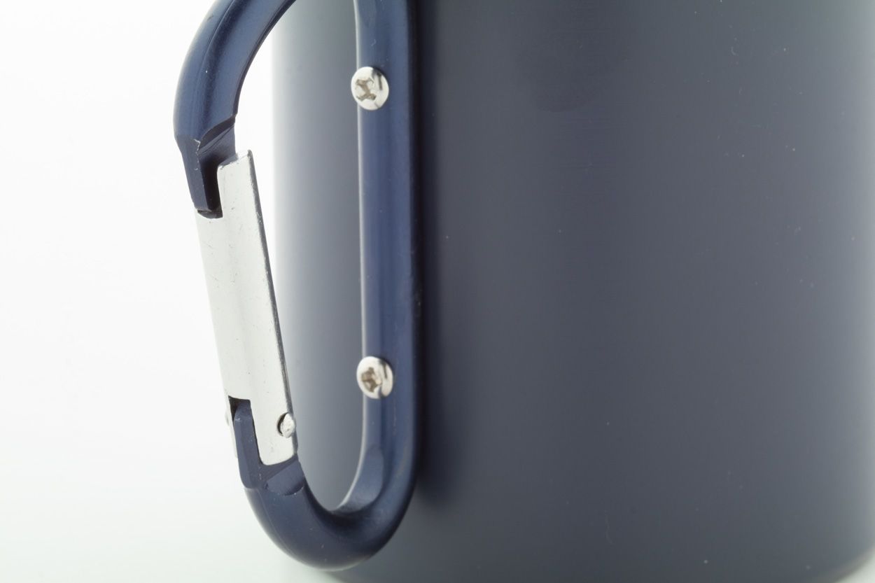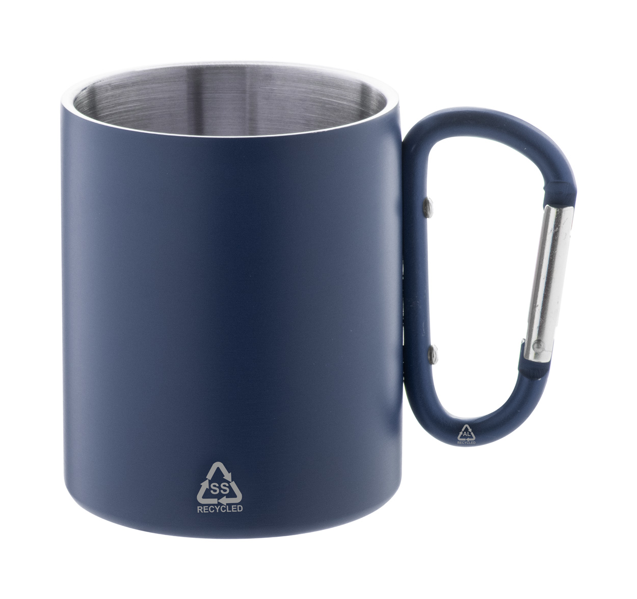 Doppelwandiger Thermobecher aus recyceltem Edelstahl mit farblich passendem Karabinergriff aus recyceltem Aluminium. Füllmenge: 300 ml. Einzeln in Kraftpapierbox.