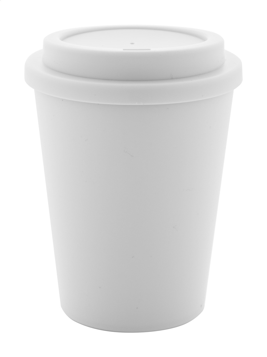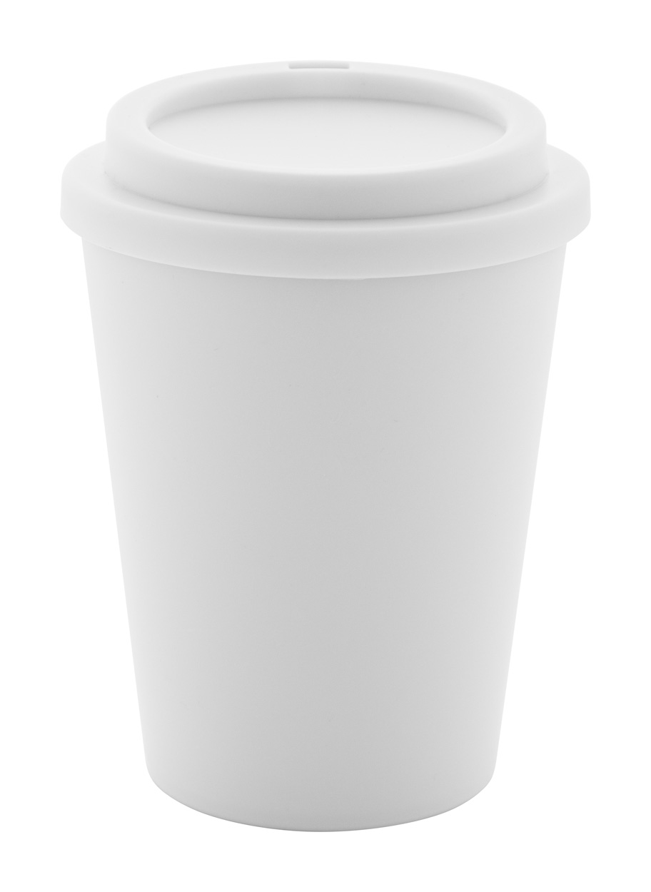 Doppelwandiger, isolierter Thermobecher aus PP-Kunststoff mit Trinkdeckel. Füllmenge: 300 ml.