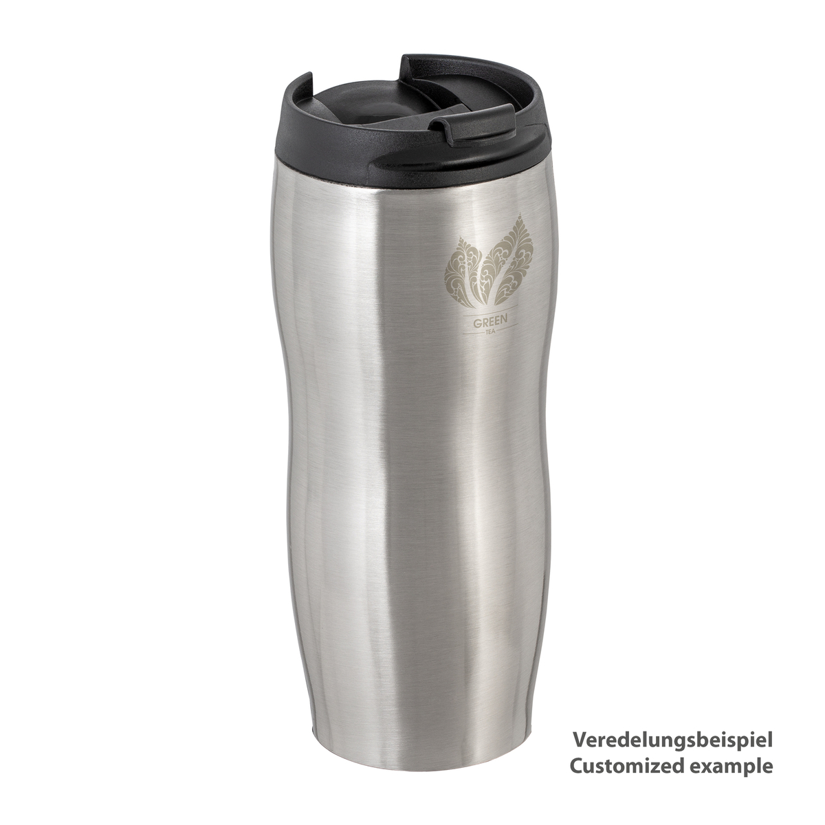 Der klassische und hochwertige Thermobecher aus Edelstahl eignet sich perfekt für Tee- und KaffeetrinkerInnen, die auf herkömmliche Papp- und Kunststoff-to-Go-Becher verzichten möchten. Der doppelwandige Thermobecher mit Kupfer-Vakuum-Isolierung hat einen auslaufgeschützten, BPA-freien Flip-Deckel und liegt durch seine leicht geschwungene Form gut in der Hand. Die Anti-Fingerprint-Beschichtung verhindert unschöne Fingerabdrücke auf dem glänzenden Edelstahl. Veredelbar mit Tampondruck oder Lasergravur. Zur Reinigung können Sie Becher und Deckel in die Spülmaschine geben, wir empfehlen jedoch eine Reinigung von Hand.
