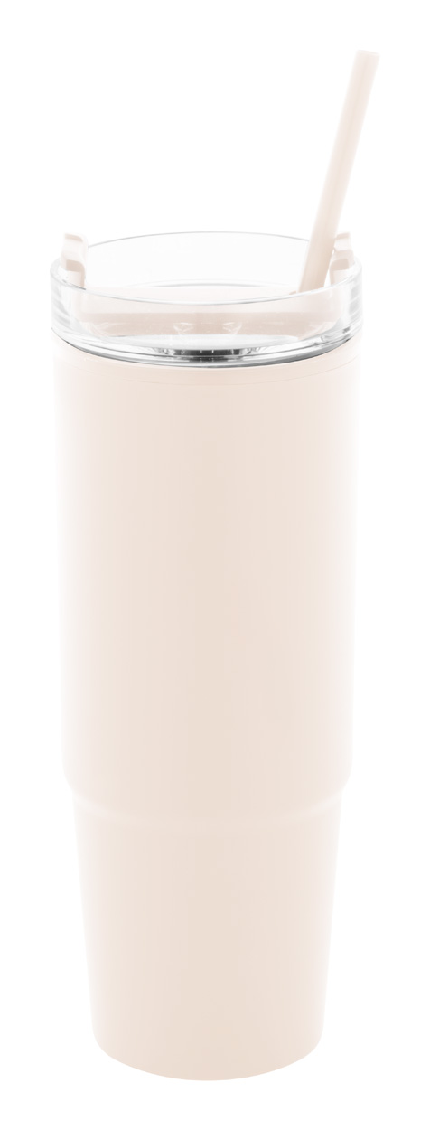 Doppelwandiger Isolier-Thermobecher aus recyceltem PP Kunststoff mit Trinkdeckel und Trinkhalm aus Kunststoff. Füllmenge: 900 ml.