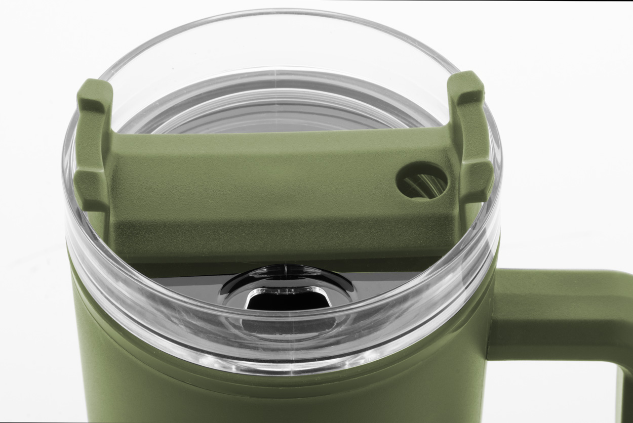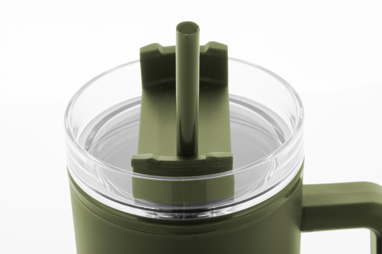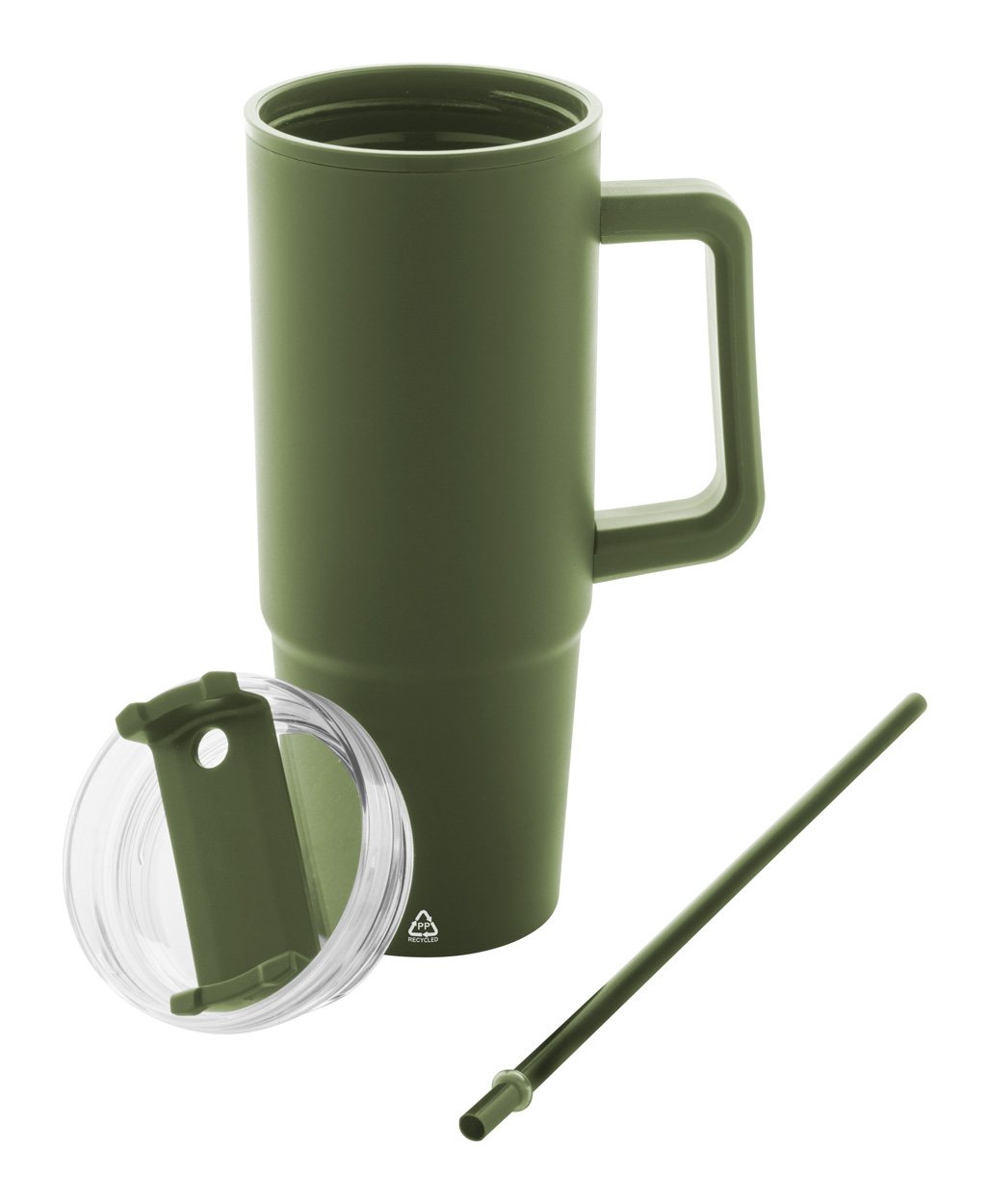 Doppelwandiger Isolier-Thermobecher aus recyceltem PP Kunststoff mit Trinkdeckel und Trinkhalm aus Kunststoff. Füllmenge: 900 ml.
