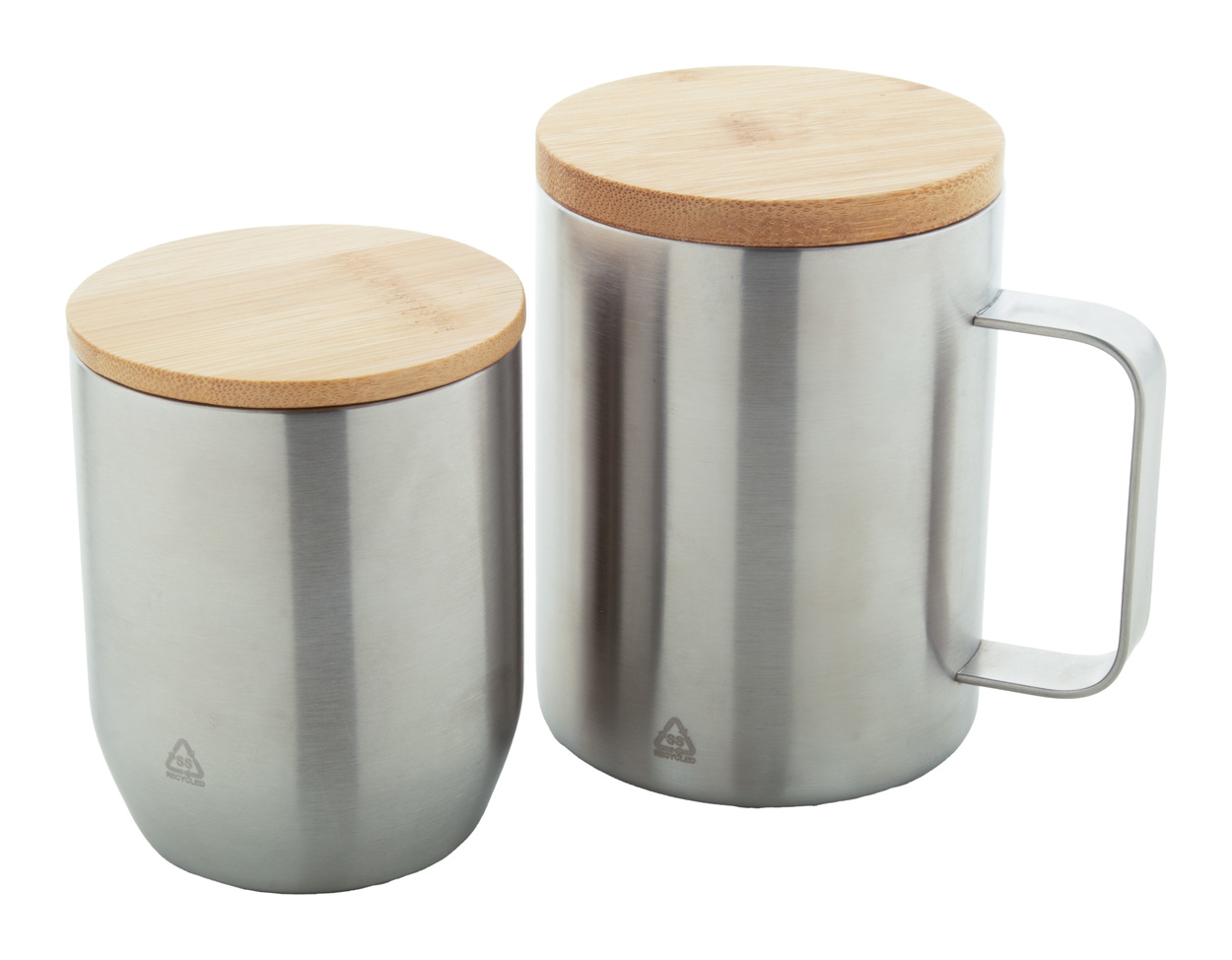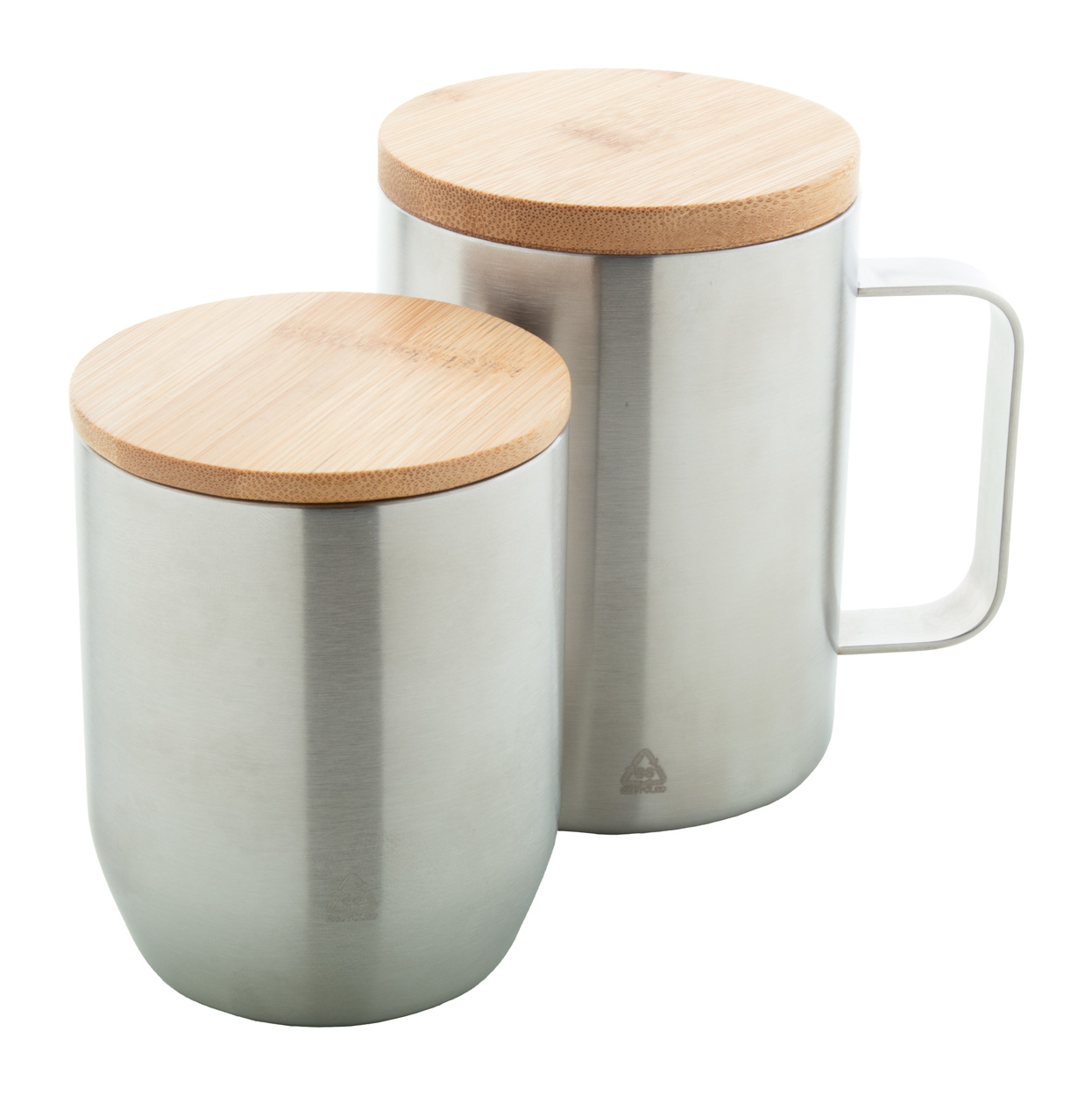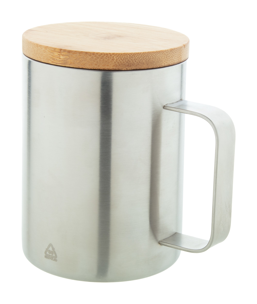 Doppelwandige Thermotasse aus recyceltem Edelstahl mit Bambusdeckel. Füllmenge: 350 ml.