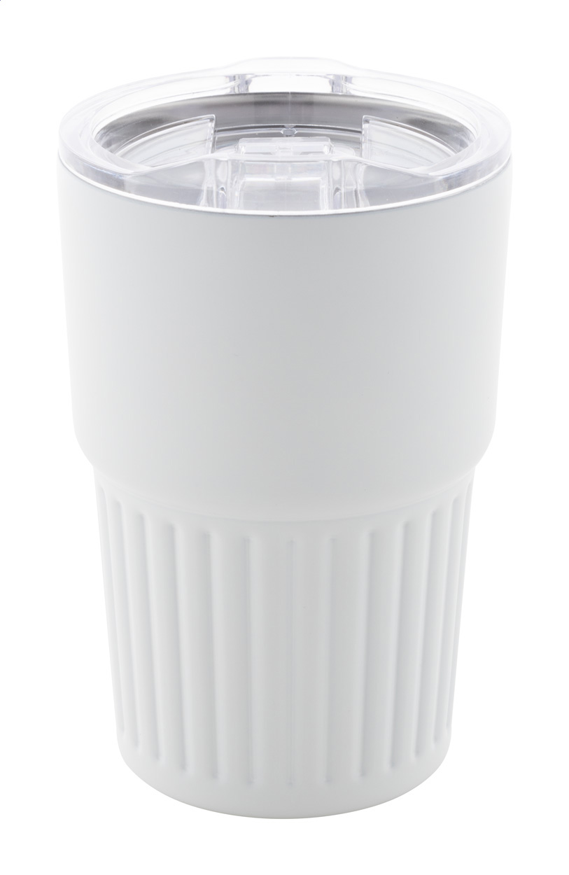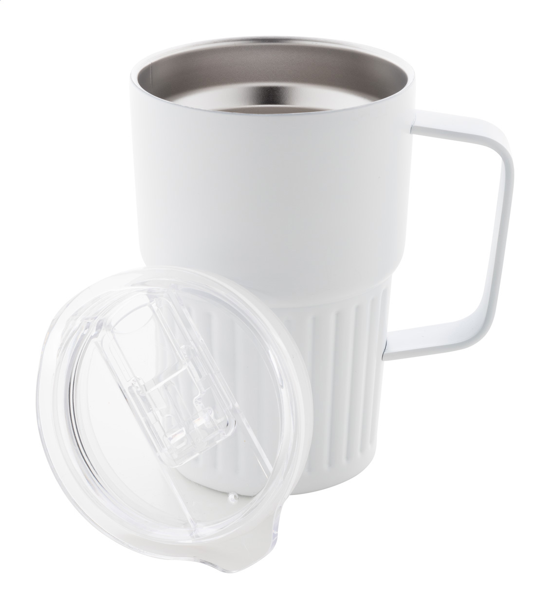 Doppelwandiger, isolierter Thermobecher aus recyceltem Edelstahl mit Trinkdeckel aus ABS-Kunststoff. Füllmenge: 470 ml.