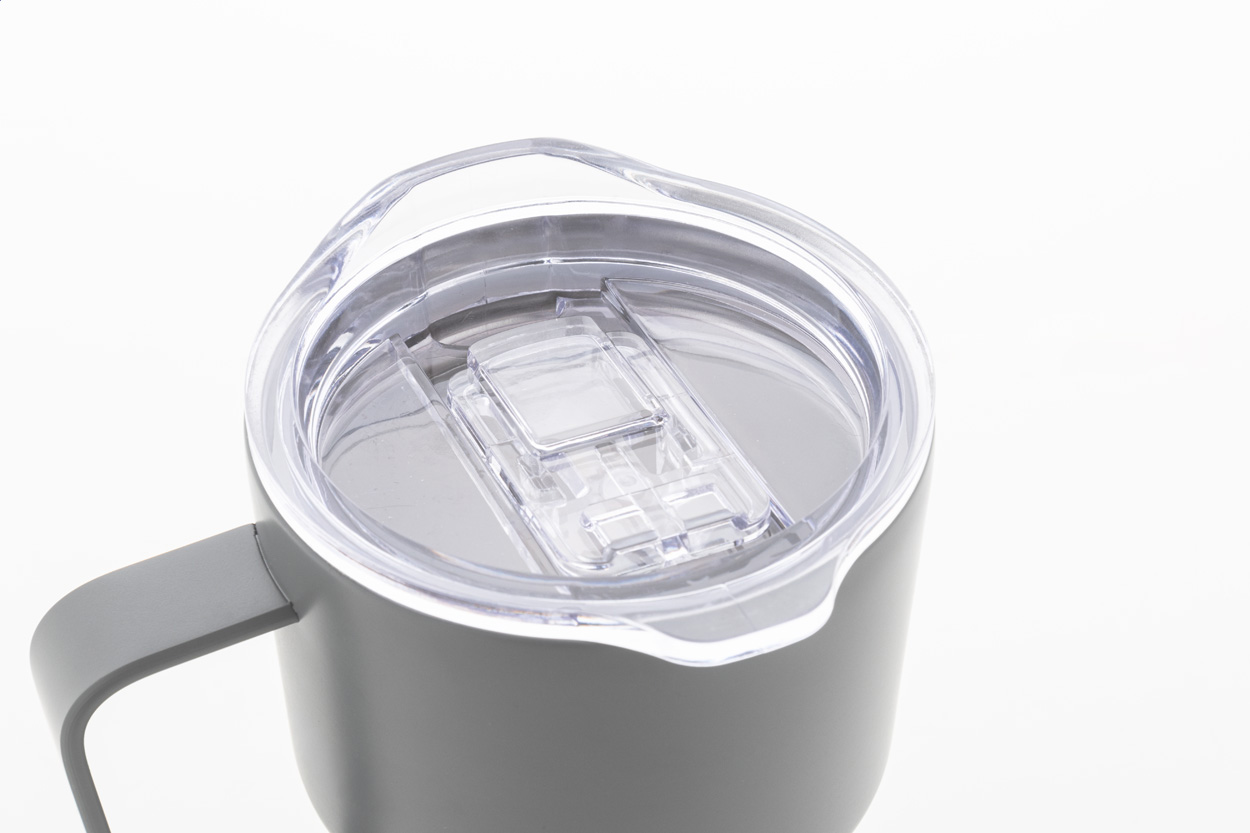 Doppelwandiger, isolierter Thermobecher aus recyceltem Edelstahl mit Trinkdeckel aus ABS-Kunststoff. Füllmenge: 470 ml.