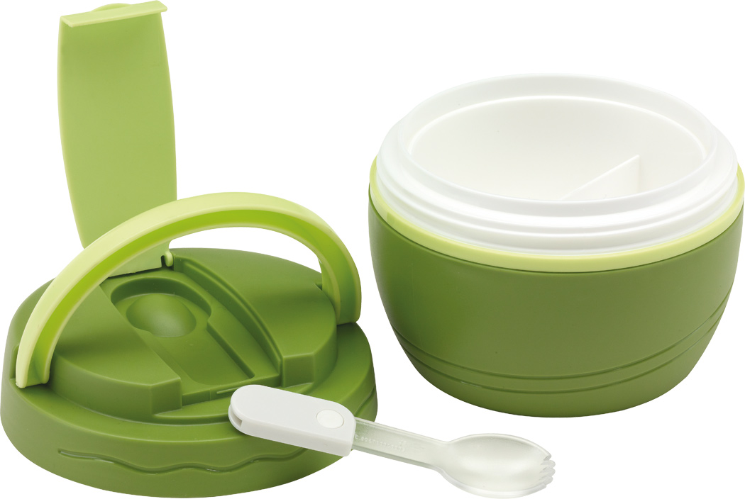 Thermobox JOKO: innen herausnehmbarer Einsatz (für die Mikrowelle geeignet) mit 2-Fächer-Aufteilung, im Schraubdeckel integrierter Tragegriff sowie Fach inkl. aufklappbarem Gabel-Löffel, Box hält Speisen bis zu 4 Stunden warm / kalt, Fassungsvermögen ca. 450 ml